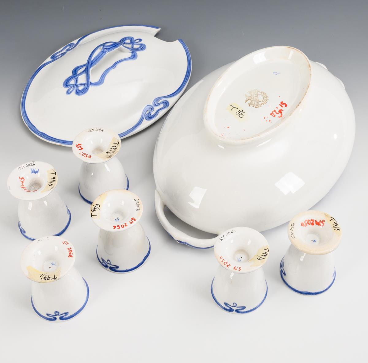 Oval tureen with 2 handles, lid with handle. Egg cup with round foot. Decor in partial relief with flowing blue bands. Slight signs of age and wear.