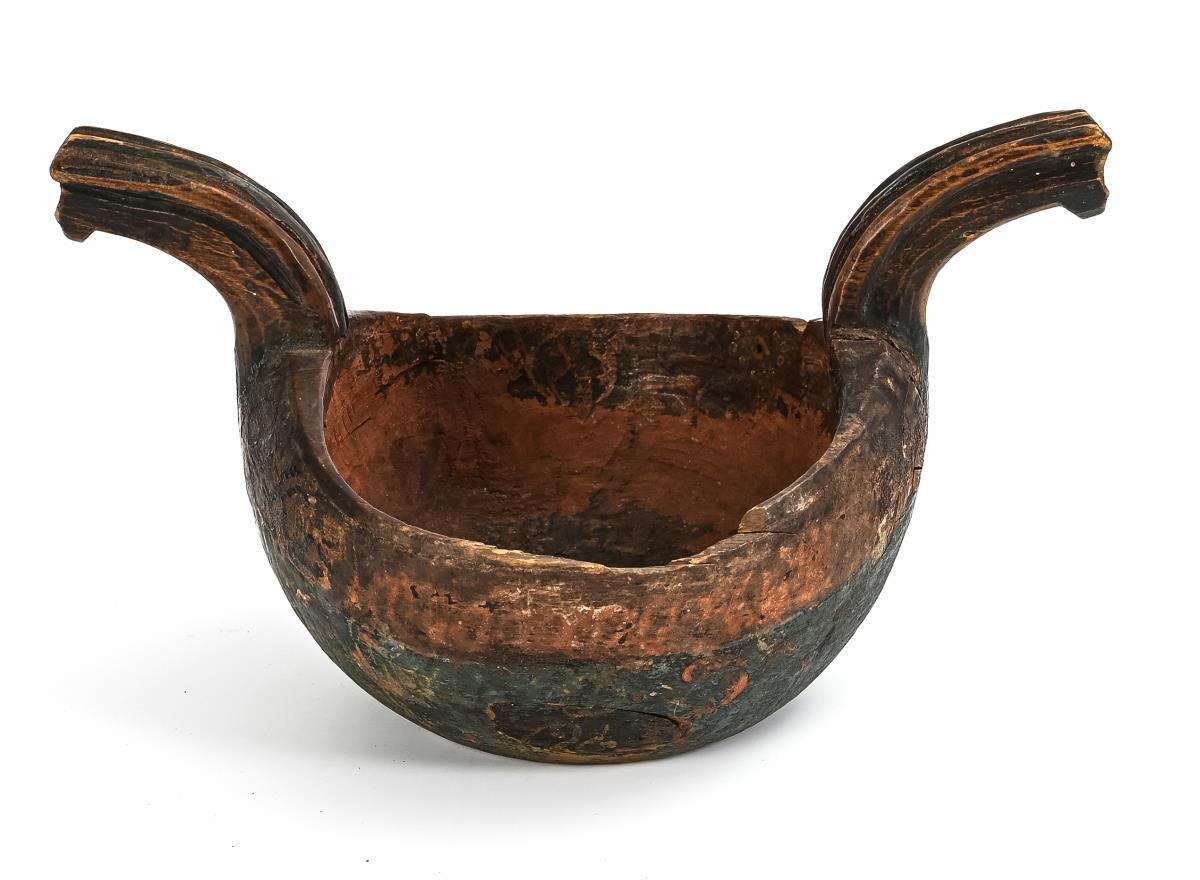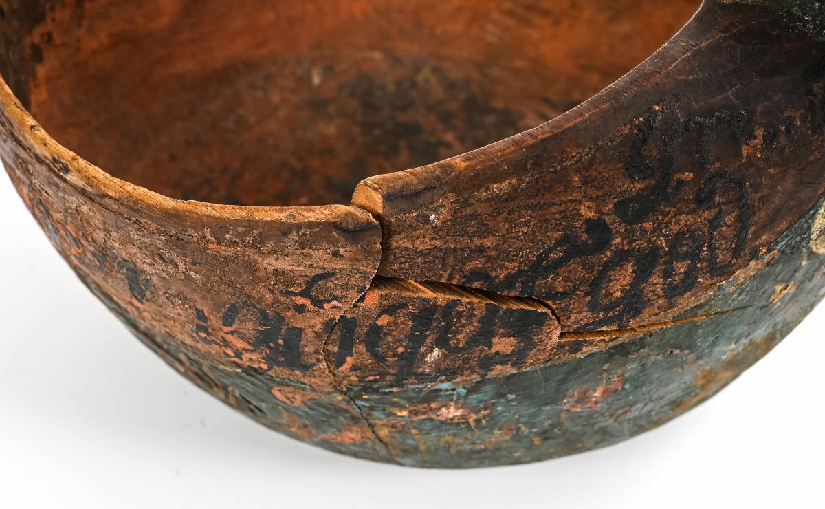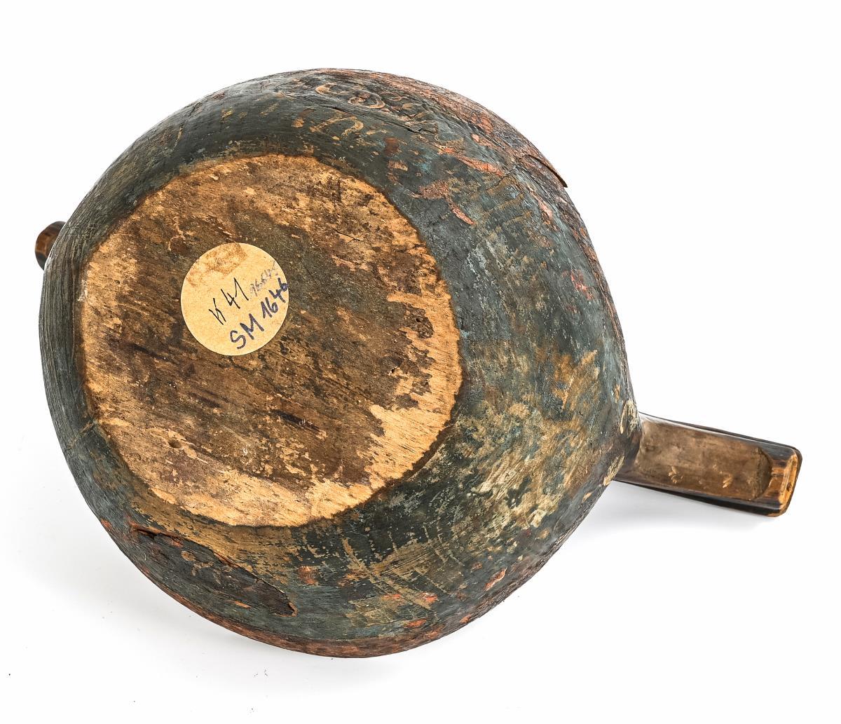 Carved from one piece, hemispherical vessel with 2 handles. Originally probably completely painted; remains of an inscription on the outside next to flowers. Dry cracks, minor losses and repairs, heavily rubbed.