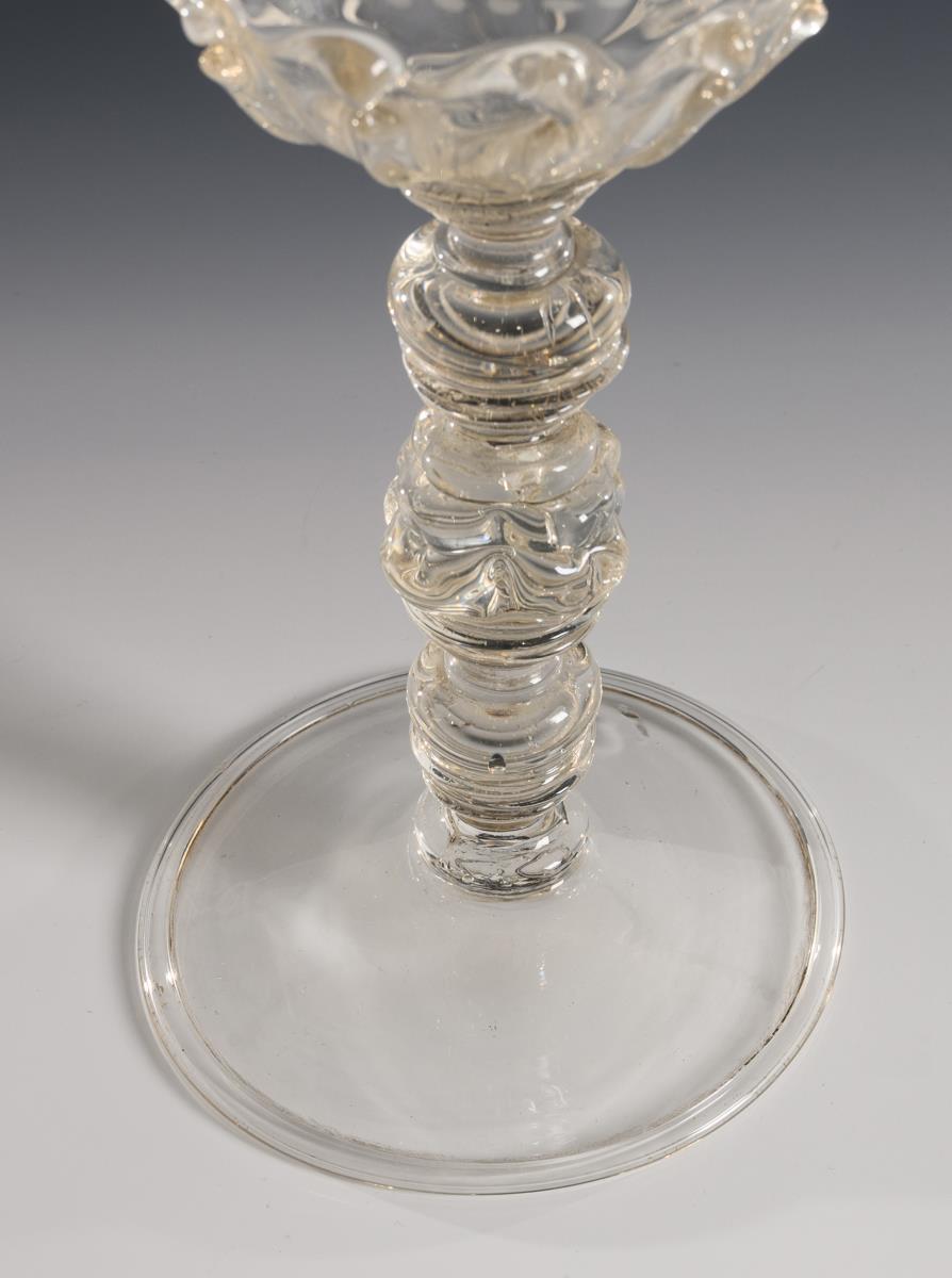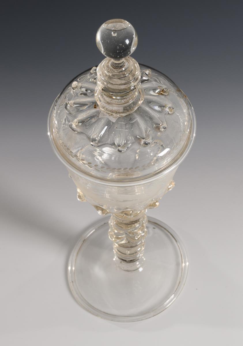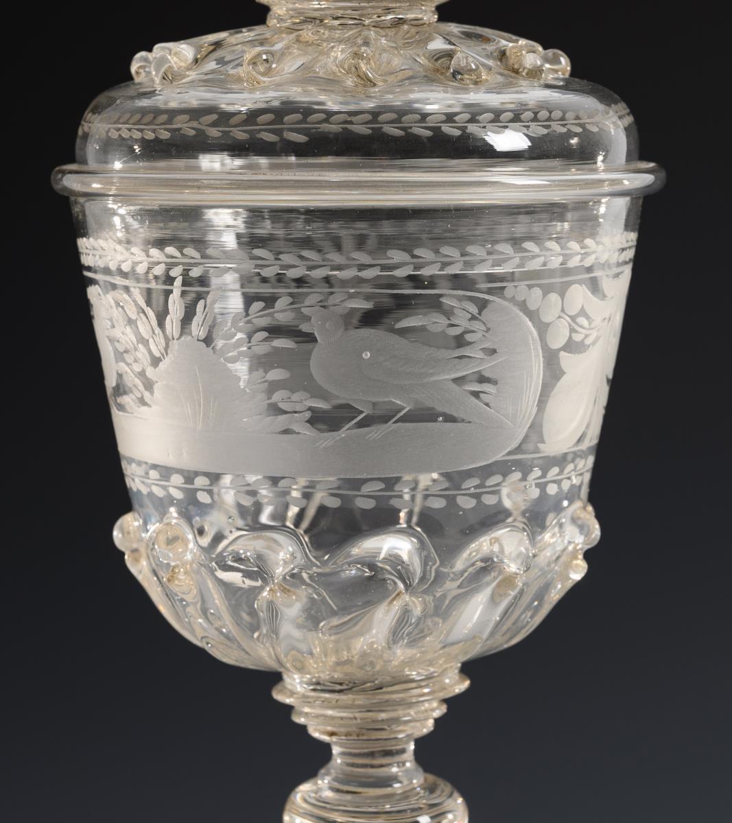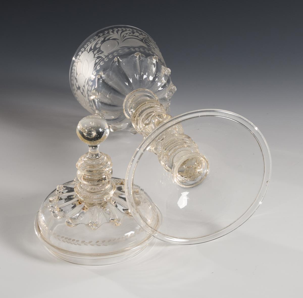 Conical bowl, ribbed at the base and on the lid, multi-jointed shaft, disc foot; with turned rim; chipped. Engraved depiction of a landscape island with pheasants on the dome, floral motif on the reverse.