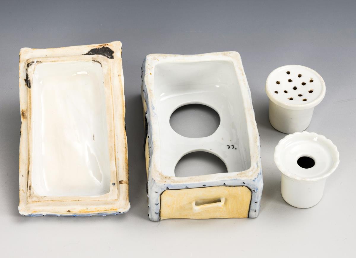 Polychrome painted, decorated in gold. 8 x 12.5 x 7.5 cm.