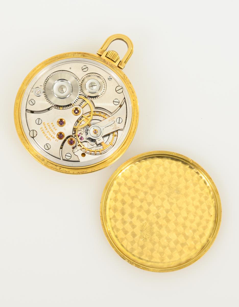 18 ct hallmarked, Helvetia hallmark, Longines company mark. Ø 4.5 cm. 51 g.