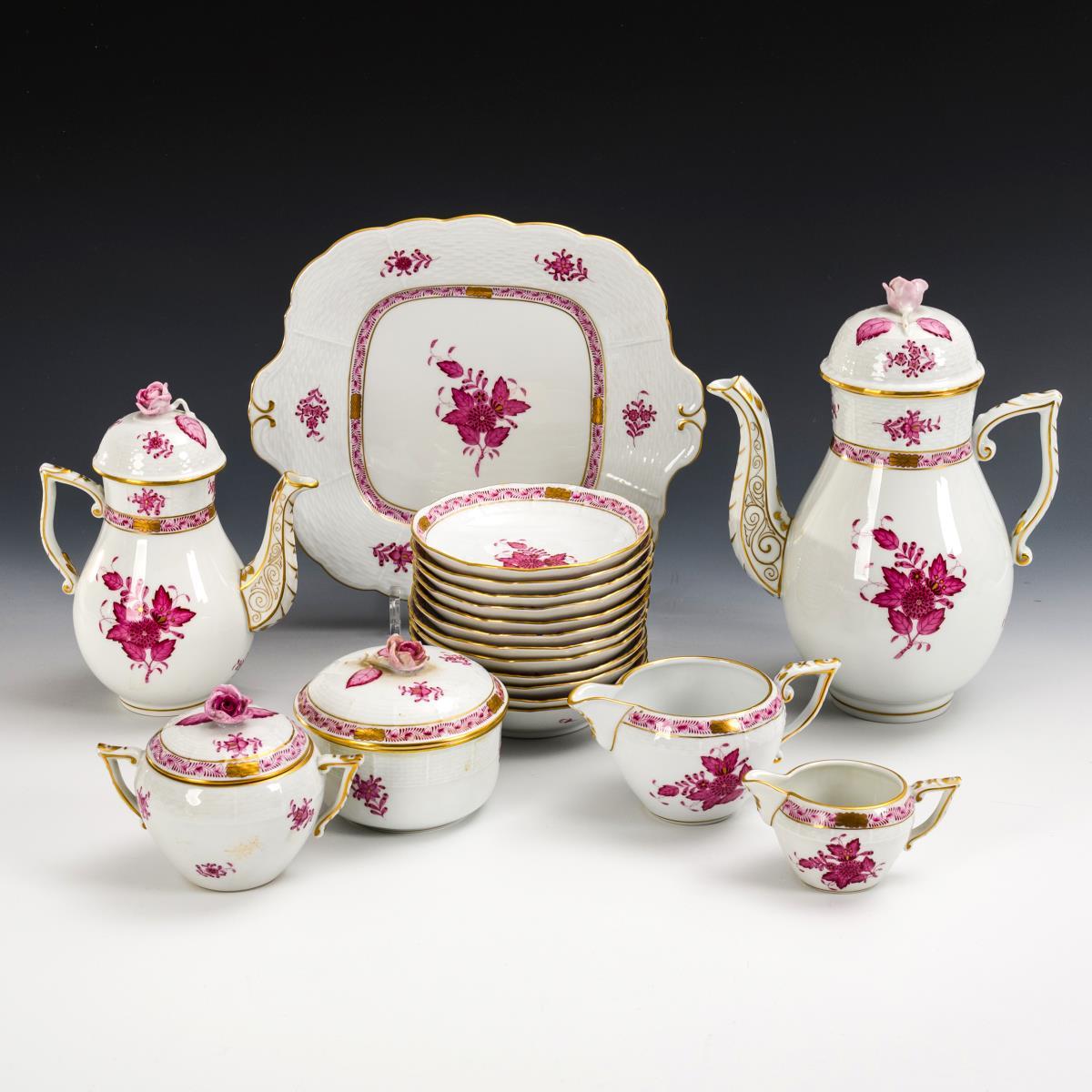 Model "Altozier". Coffee pot (h 25.5 cm), mocha pot (h 19.5 cm), 2 milk jugs (h 5 and 7.5 cm), 2 sugar bowls (h 10 cm), 12 saucers and 1 credenza plate (27.5 x 24 cm). Chip to 1 saucer rim, 3 rose finials chipped.