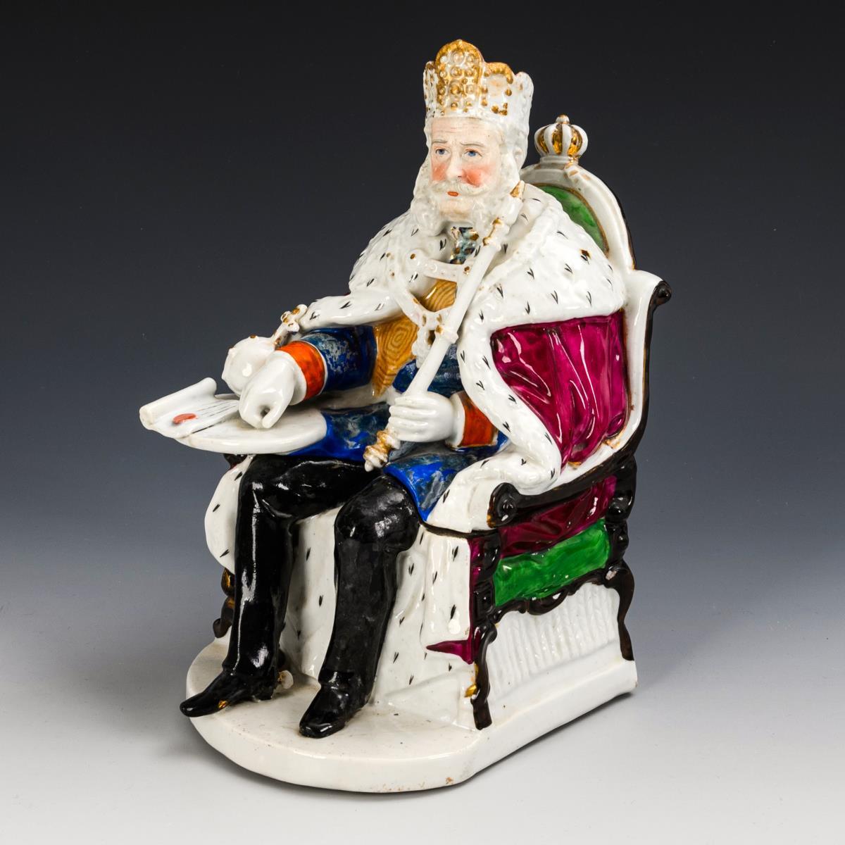 Emperor Wilhelm I seated on the throne with the imperial insignia. Gold rubbed, both legs, scroll, sceptre pommel and crown restored, hairline crack in the base.