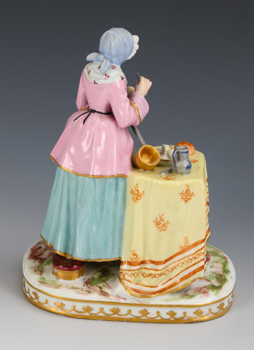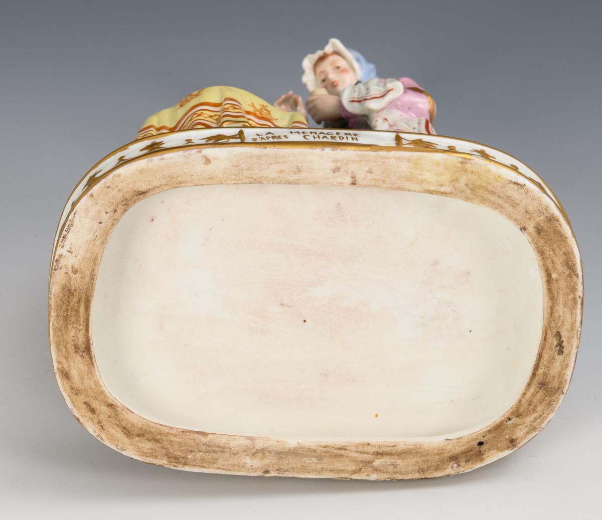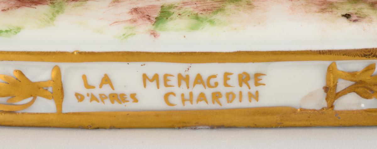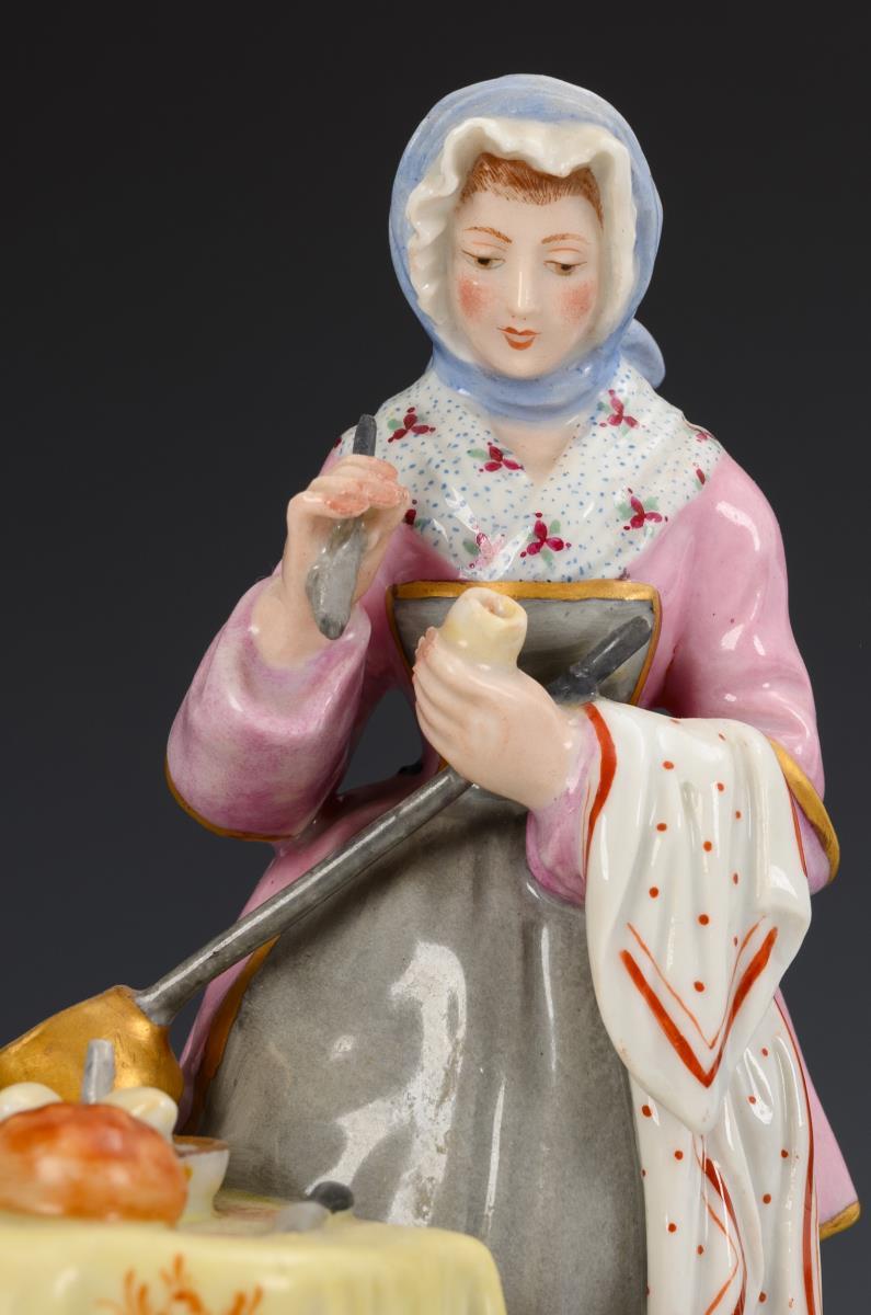 A young woman standing at a table with jug, jar, bread, plate and cutlery, opening an egg, after a painting by Jean Baptiste Simeon Chardin (1699-1779) from 1747, inscribed on the base "La Menagere d'apres Chardin". Spoon handle, stem end of the jar and plate restored.