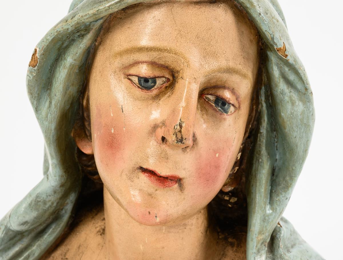 The pensive Mother of God with a light blue headscarf and in a red dress. Sawed bust of a large figure, chipped wood, dry cracks, chipped paint on the younger version.