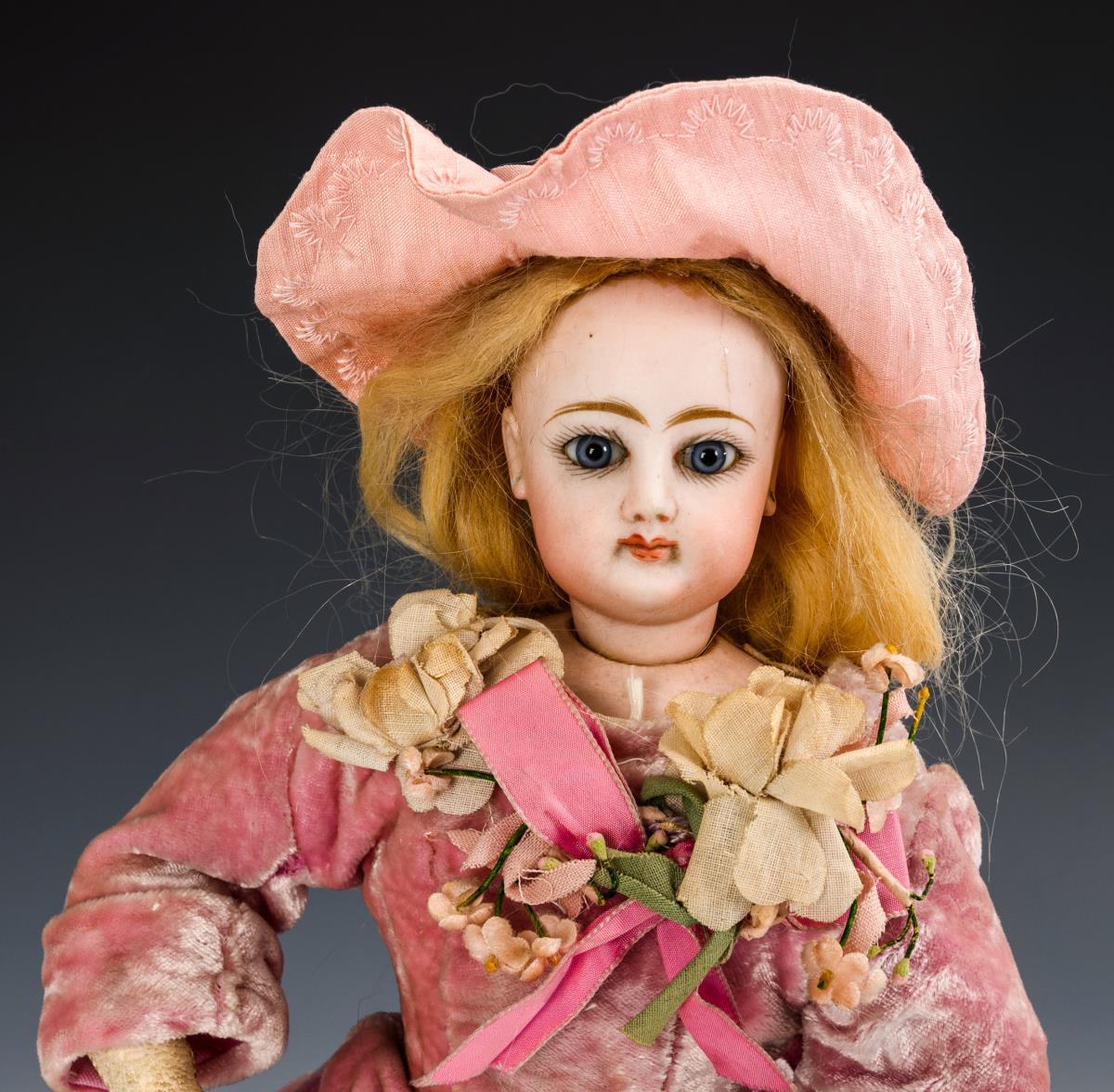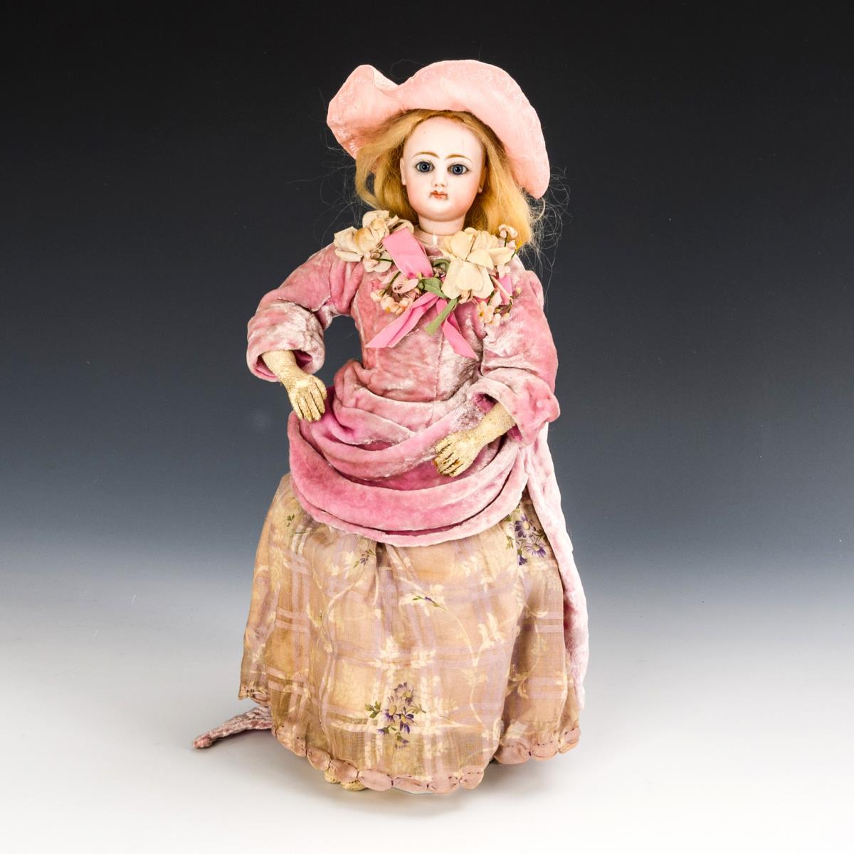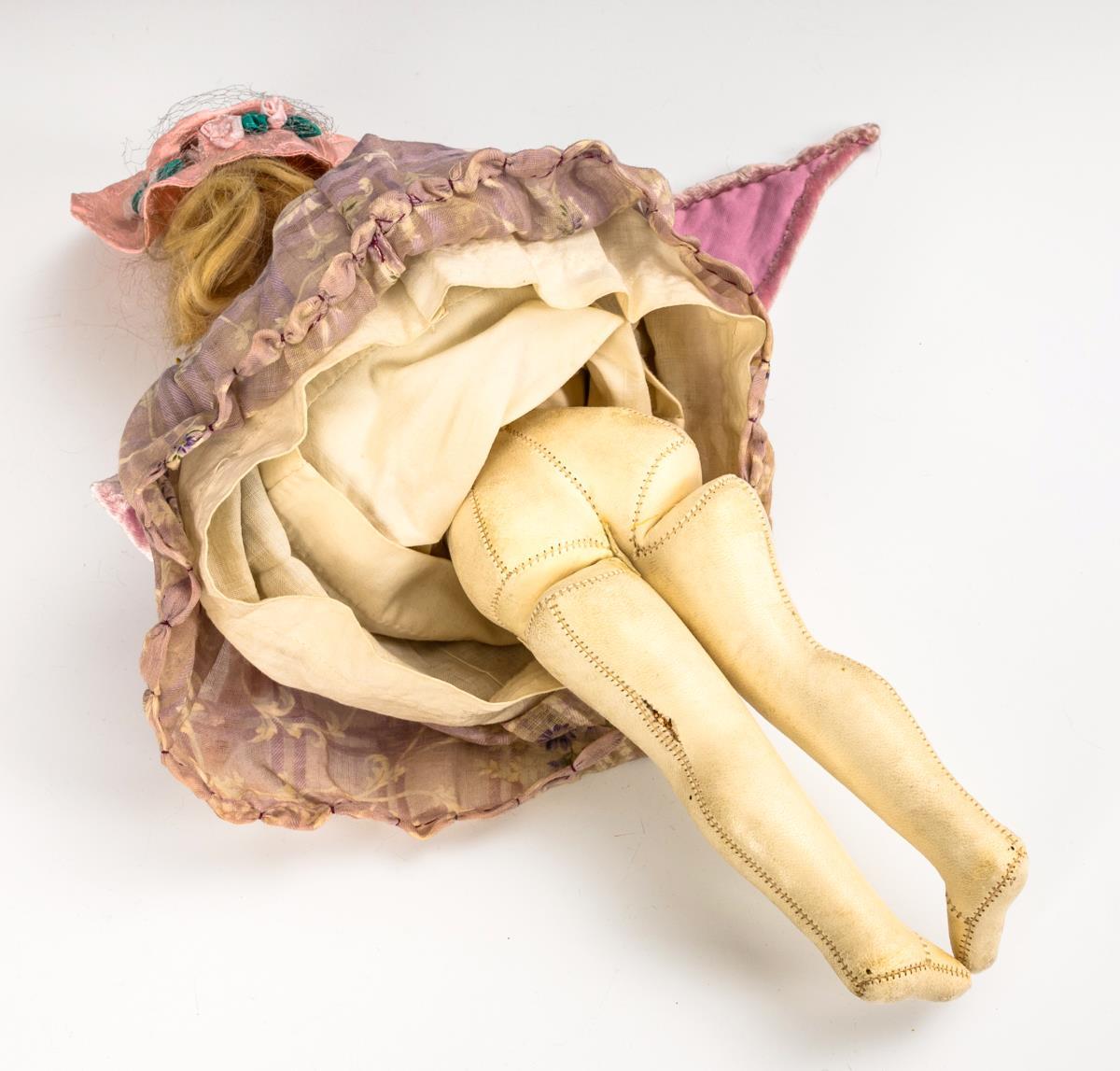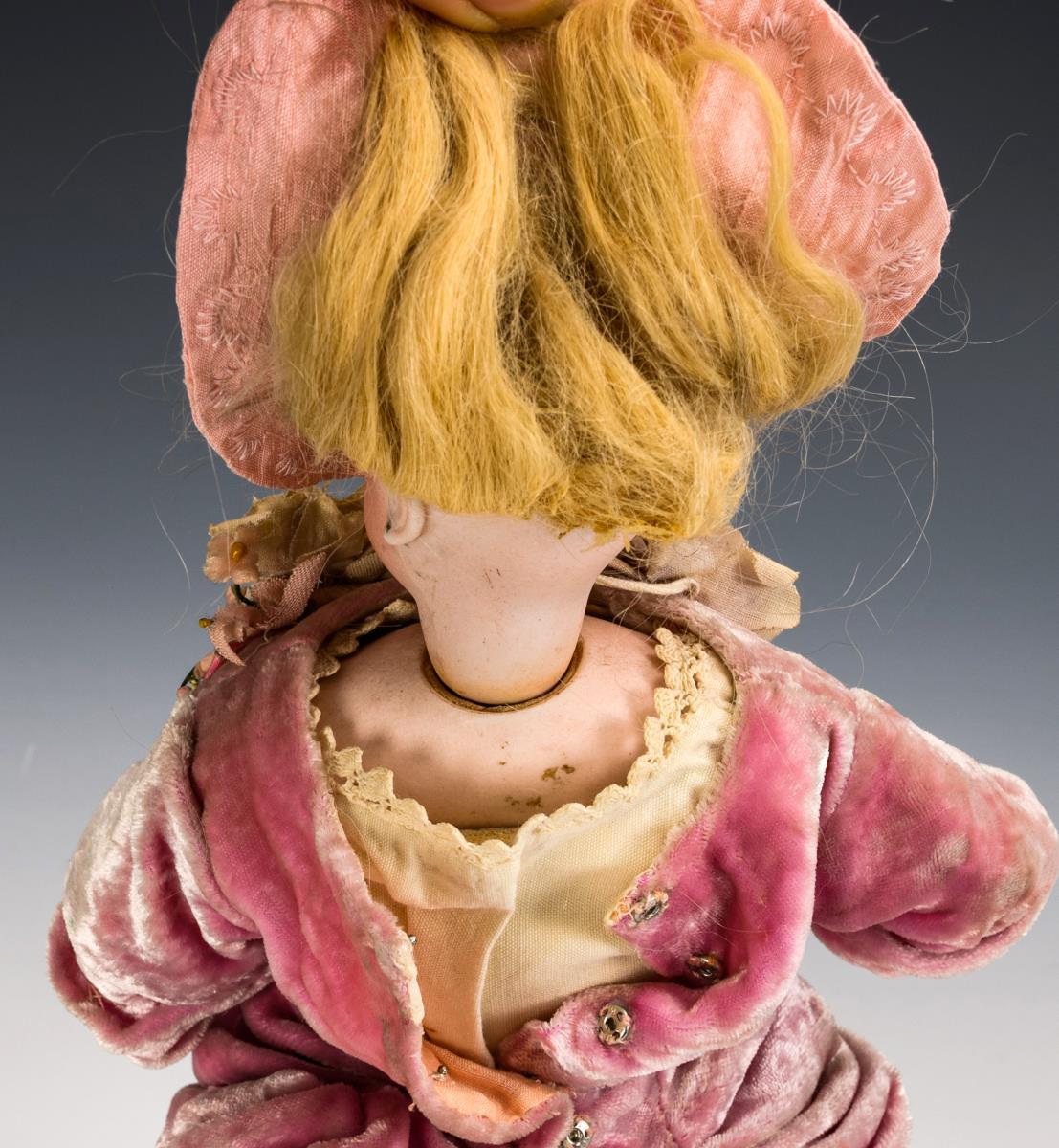 Cranked head on a breastplate, fixed blue glass eyes, closed mouth, blond mohair wig. Slender leather body with gussets on buttocks and elbows, hands with individually stitched fingers. Dressed in pink, some parts re-stitched. Hairline tear above the left eye. Signs of age, small defects.