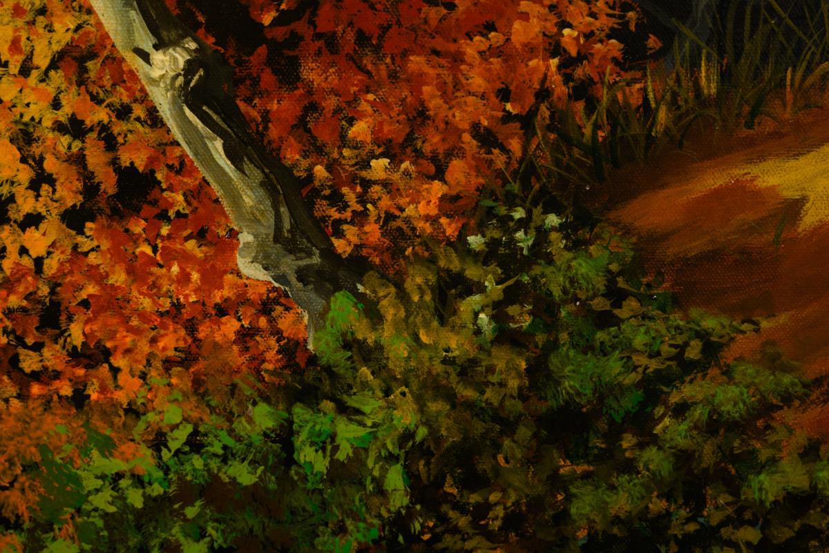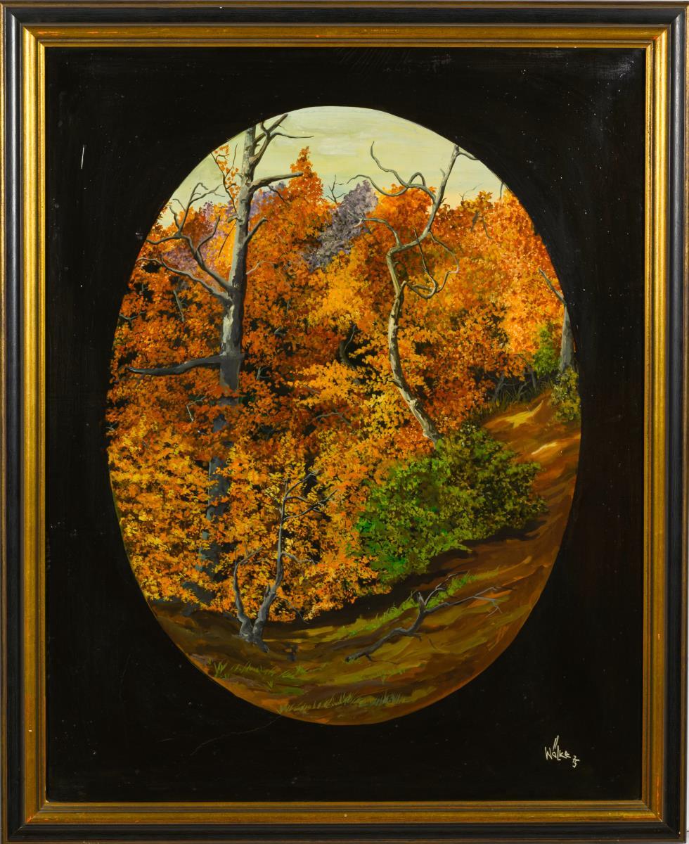 Luminous autumn colors of the forest with oval image detail. Slight traces of age.