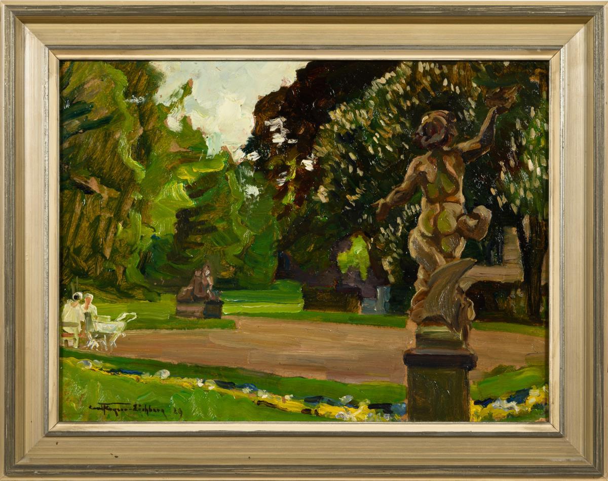 Staffage figures in the sun on a bench in a green park with sculptures.