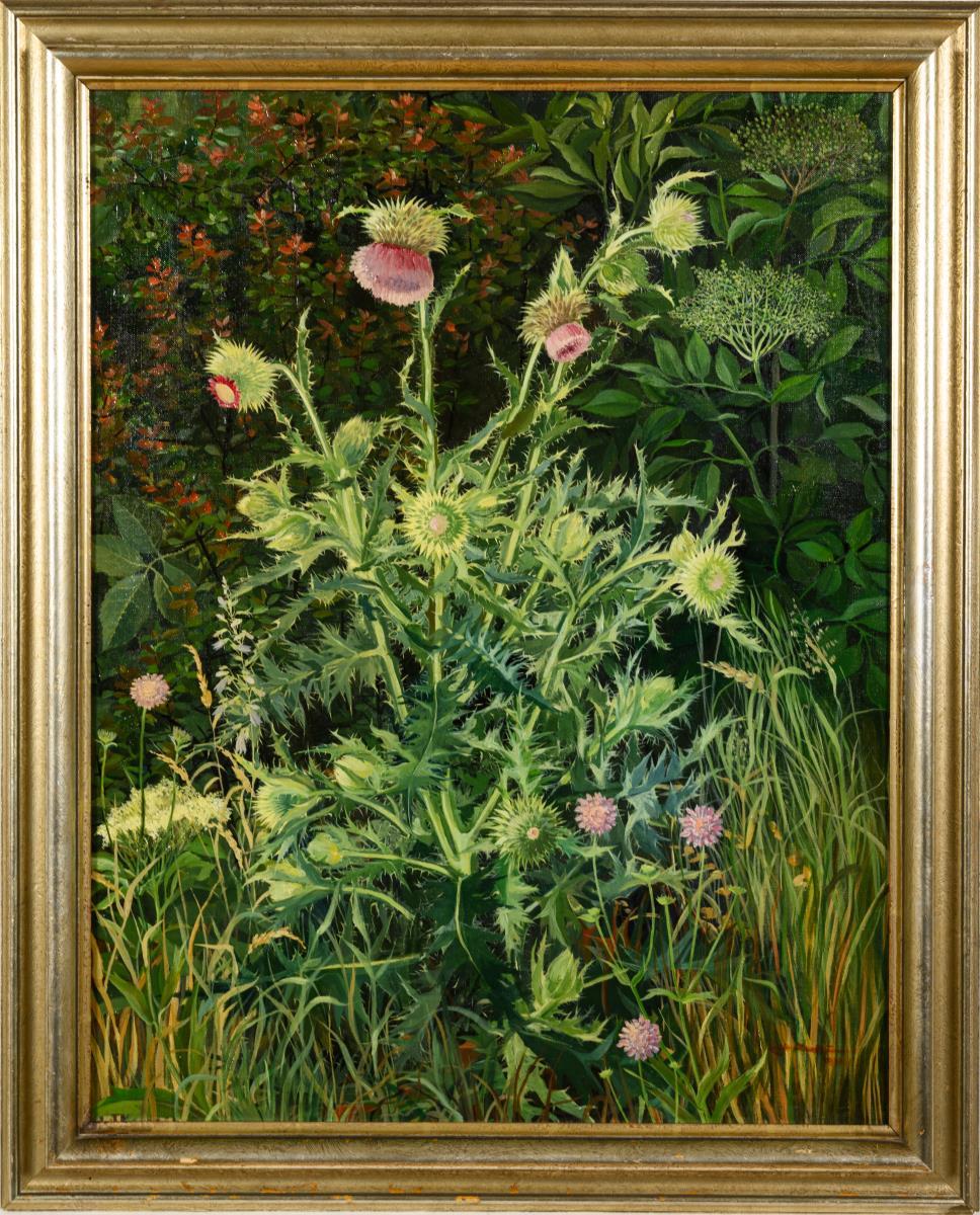 Painted in the style of New Objectivity, flowering plant in the meadow in front of larger plants.