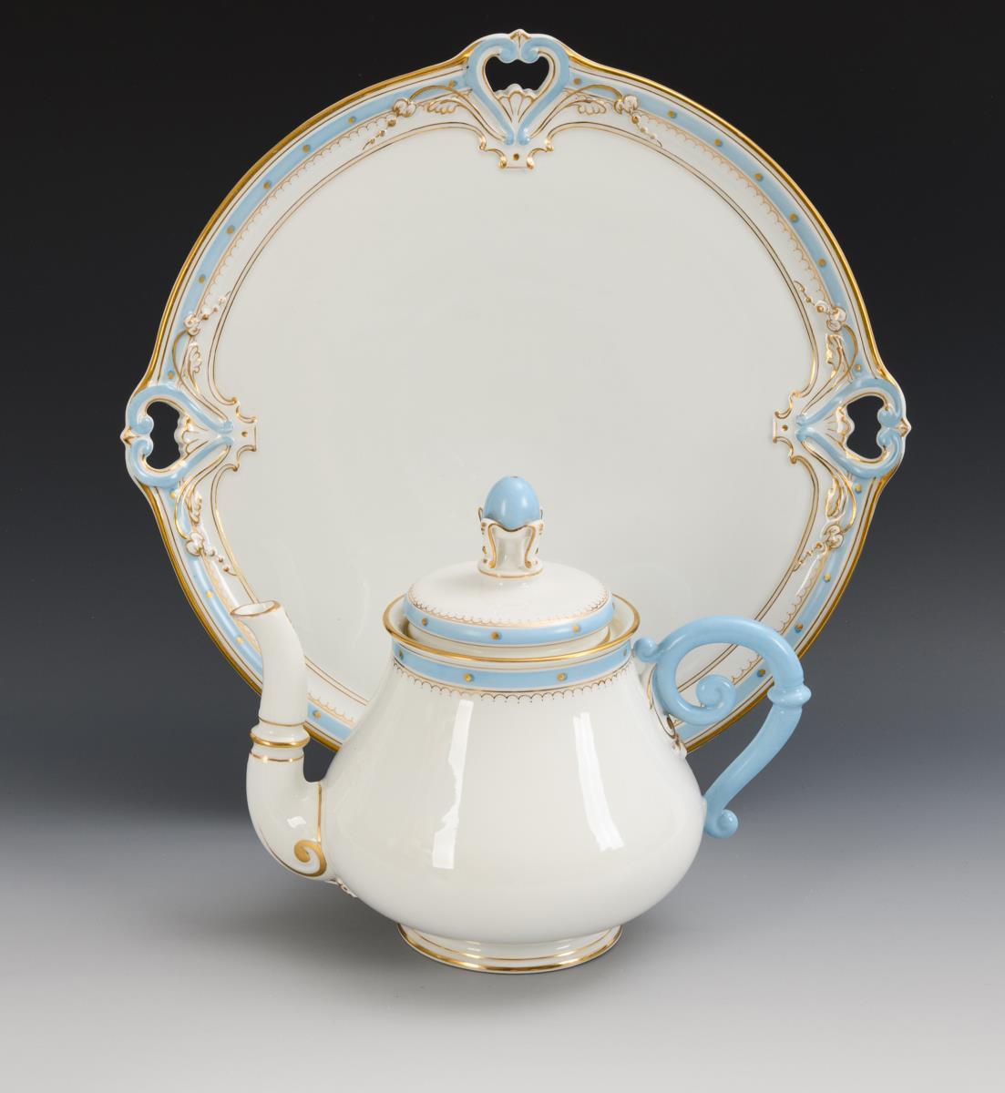 Coffee pot (without lid; h 20.5 cm), teapot (h 19 cm), milk jug, sugar bowl, 10 coffee cups with 12 saucers, 7 teacups with 12 saucers and 1 cake plate (Ø 35 cm). Bump to the top of the coffee pot, partial gold abrasion.