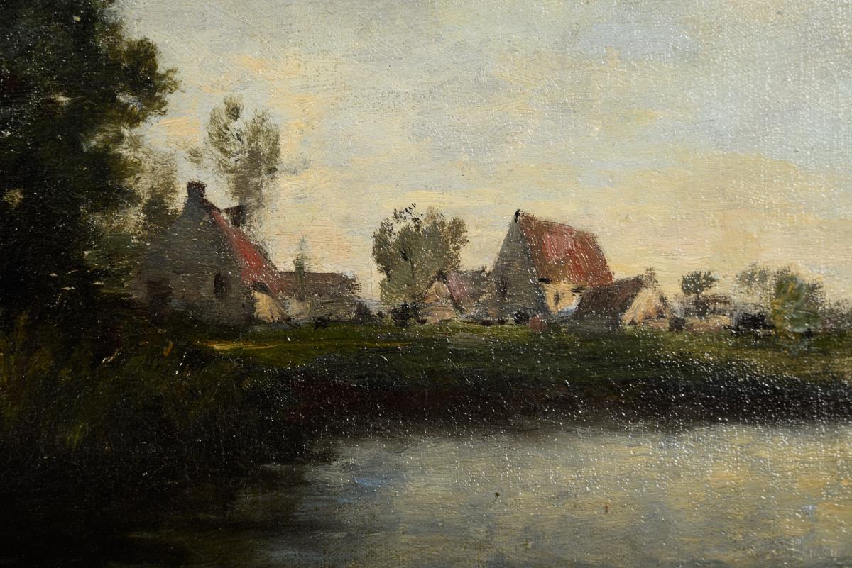 French village landscape with birch trees on the banks of a river. Doubled canvas.