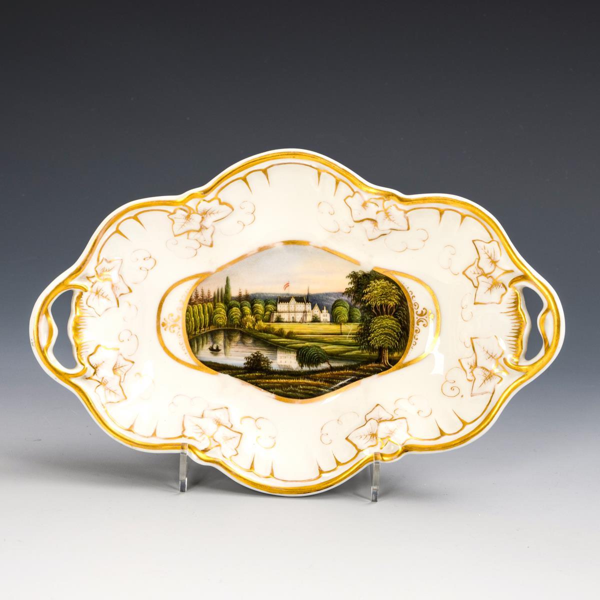 Oval hexagonal bowl with two handles and ivy relief. In the mirror the view of Reinhardsbrunn Palace. Gold somewhat rubbed.