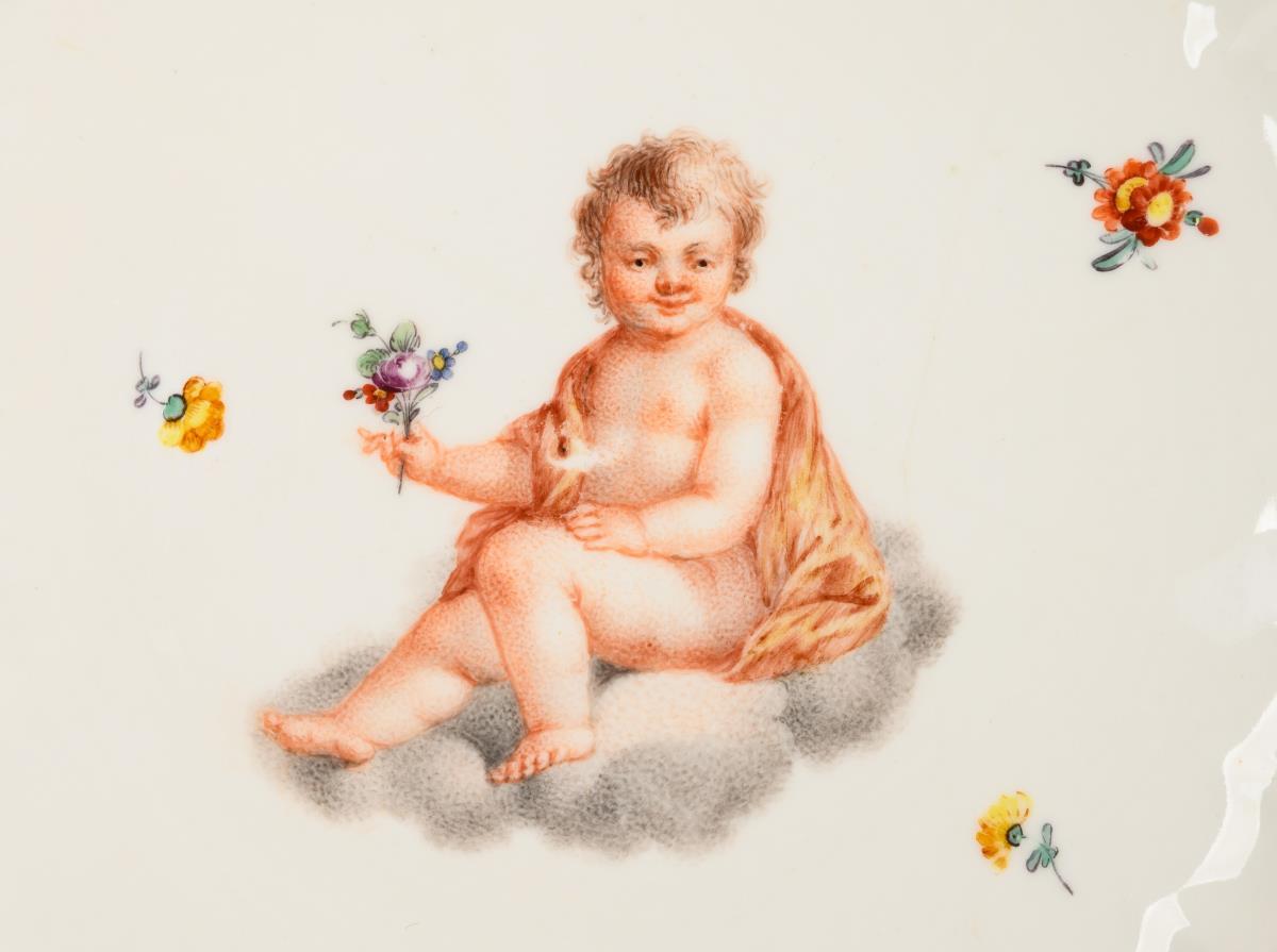 Dining plate with matching rim, in the mirror the depiction of a putto sitting on a cloud surrounded by scattered flowers with a bouquet of flowers. Hairline spider in the mirror, partial gold abrasion.