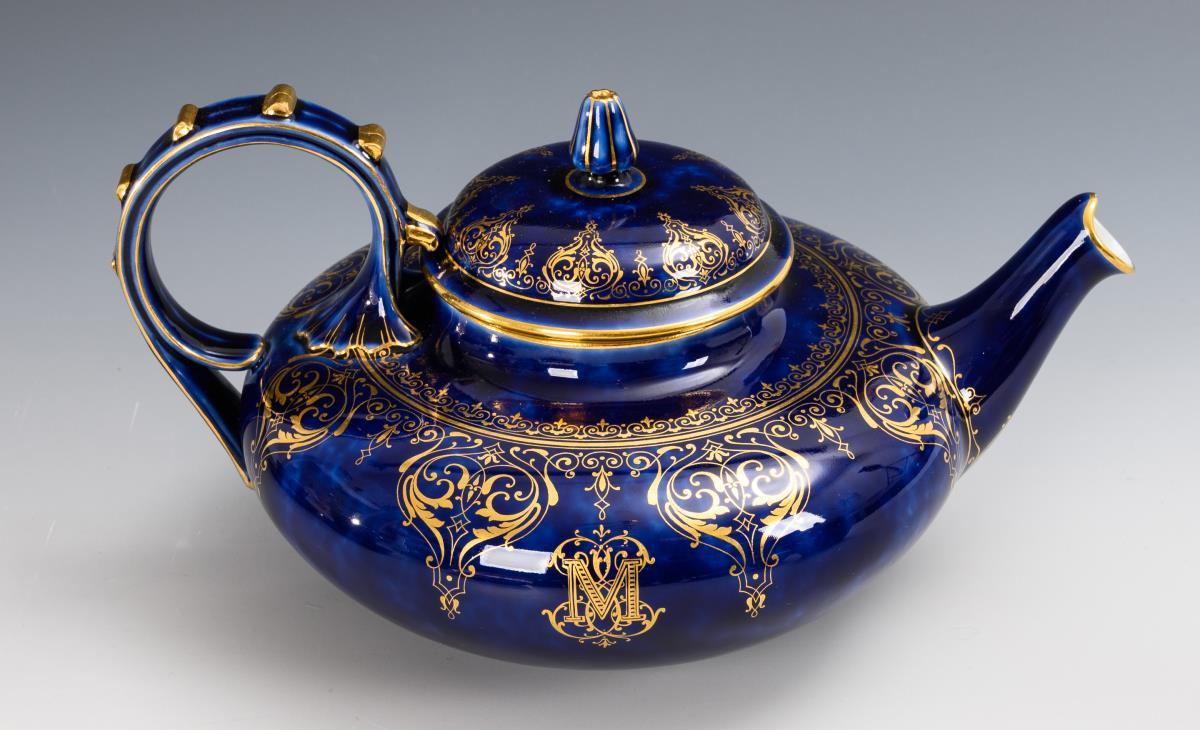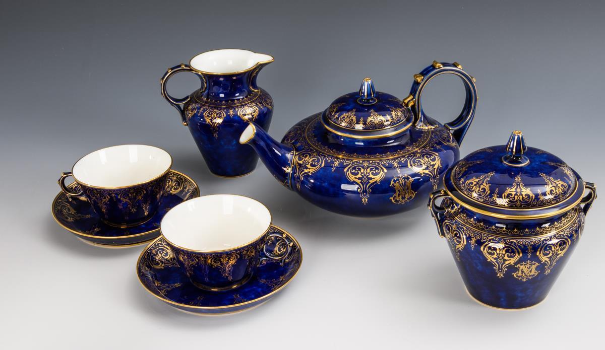 27 pieces. A domed teapot (h 12.5 cm), milk jug, sugar bowl, 12 cups and 12 saucers. On the front the ligated monogram "ME". Minimal wear to the rim.