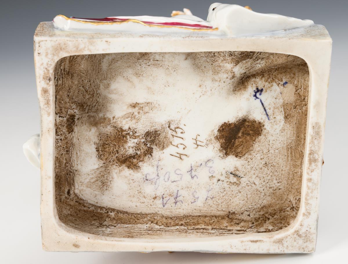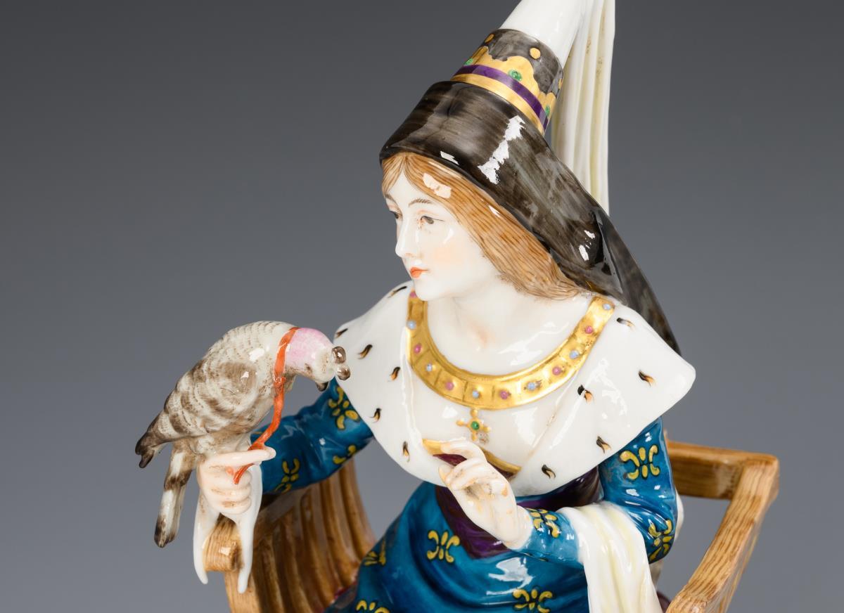 Historicizing depiction of a young lady sitting in a scissors chair with a hennin, carrying a falcon on her right hand. Band of the falcon, 1 finger and tip of the hennin chipped.