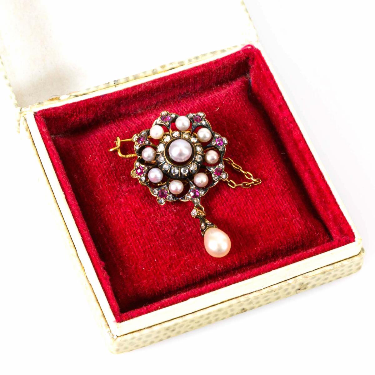 Antique brooch with pearls, rubies and old-cut diamonds.