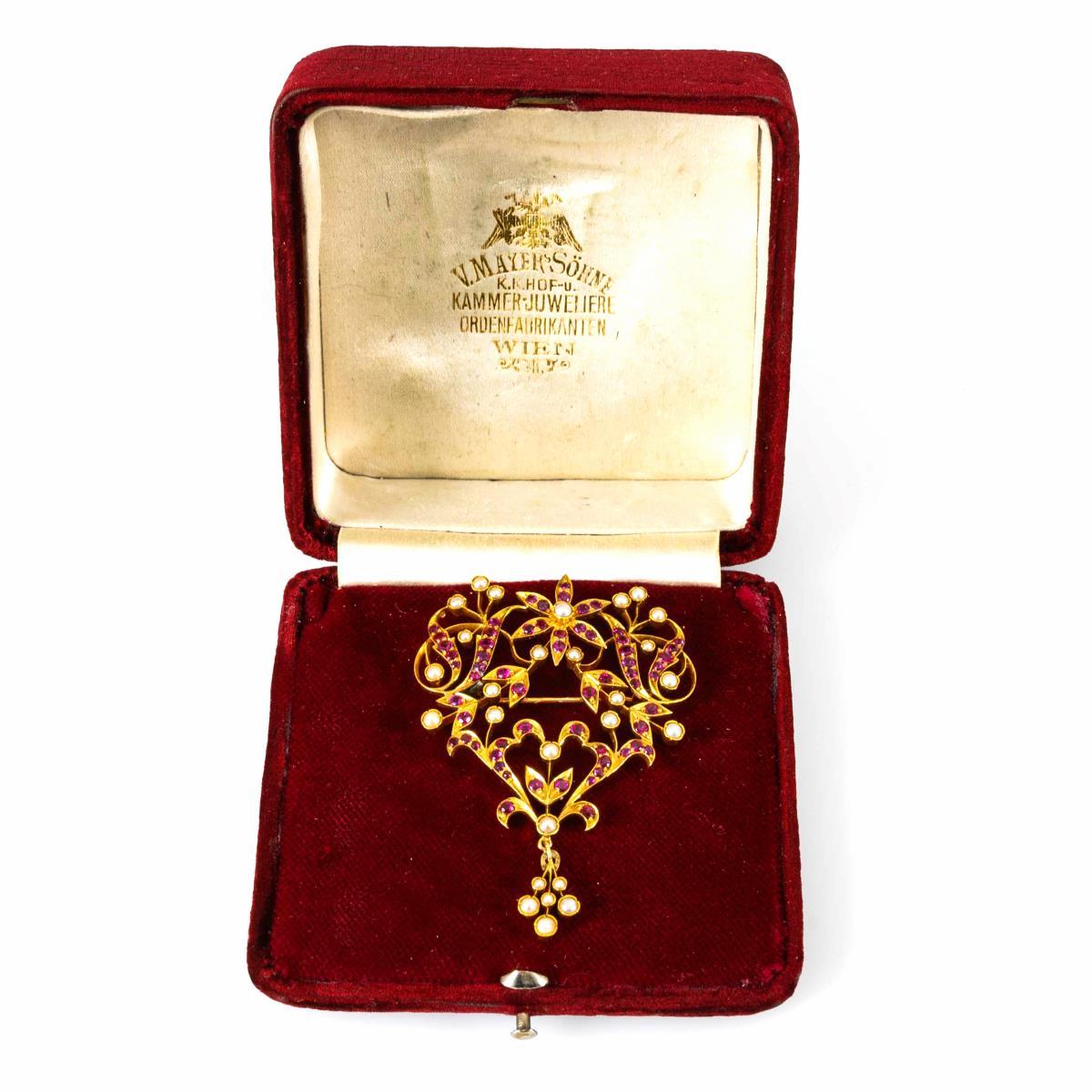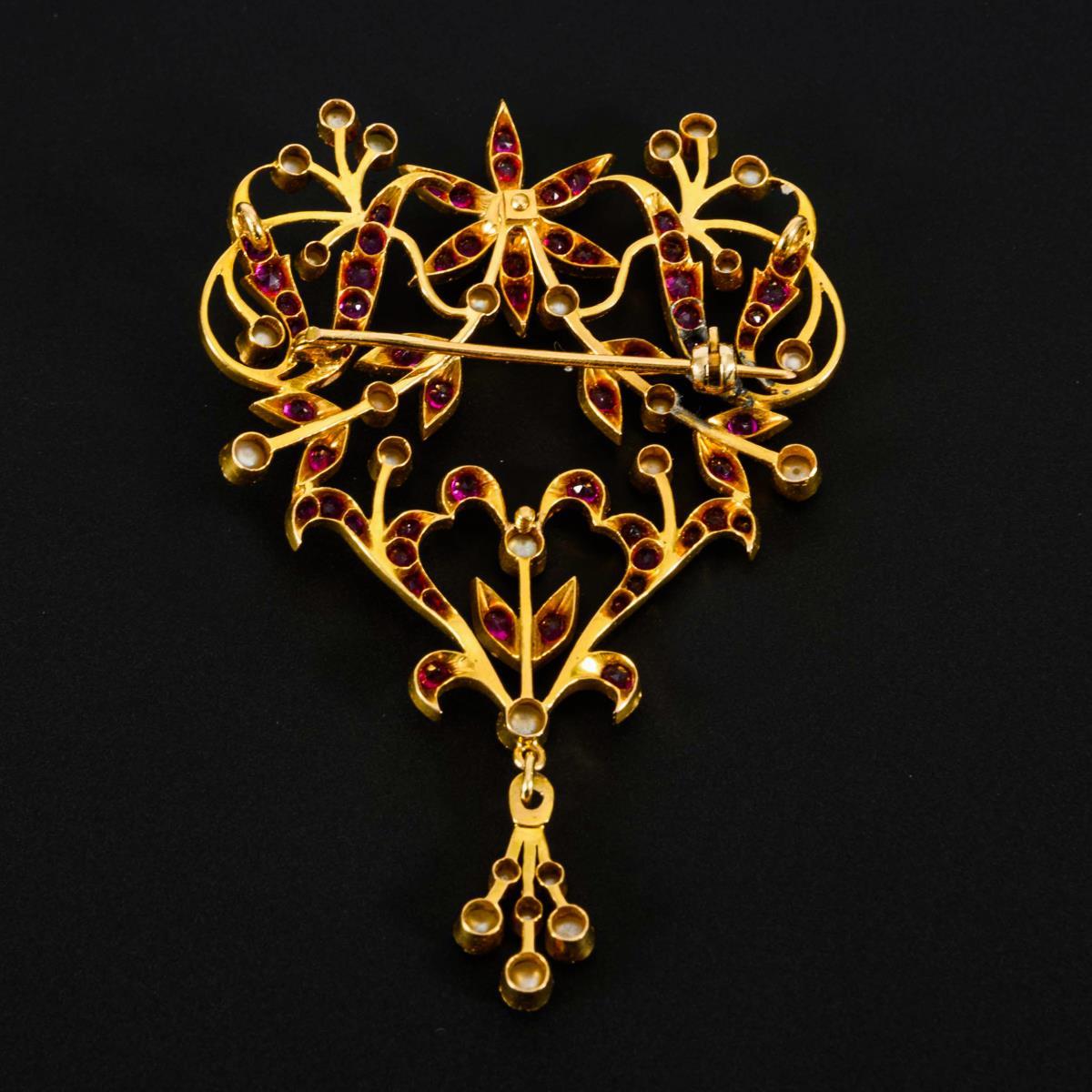 Floral ornamental brooch/pendant, set with 27 pearls and 62 rubies. On the back, 2 rigid eyelets and an additional ball hook. The central leaf with a threaded bar on the back and a small screw connection. Small soldered spots near the ball hook. Small threaded bridge behind bead set in frame.
