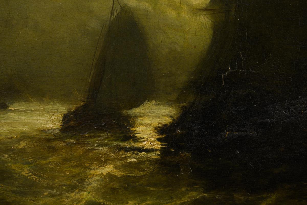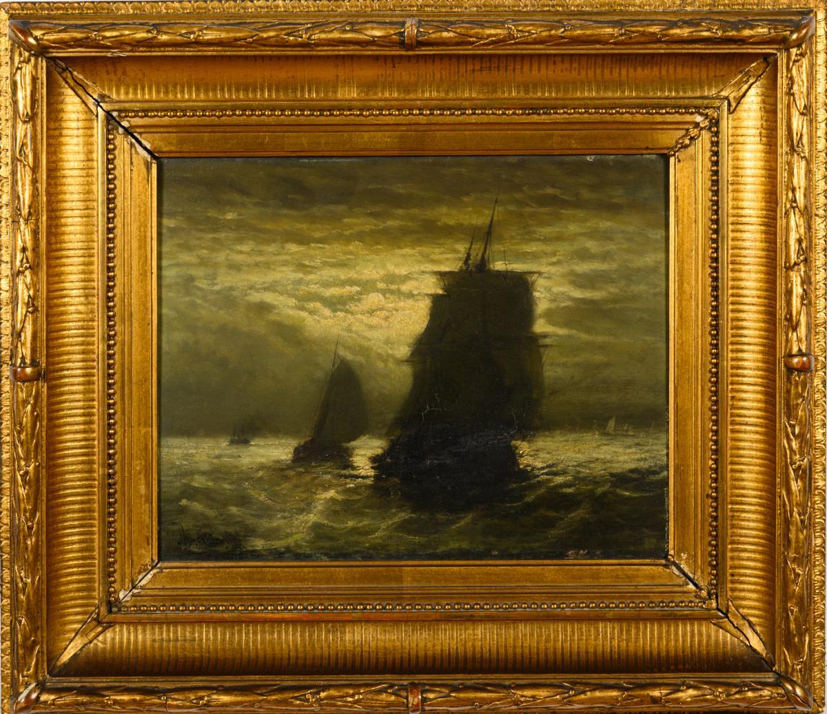 Many ships and other sailors in the bright light of the moon on the sea. Age marks.