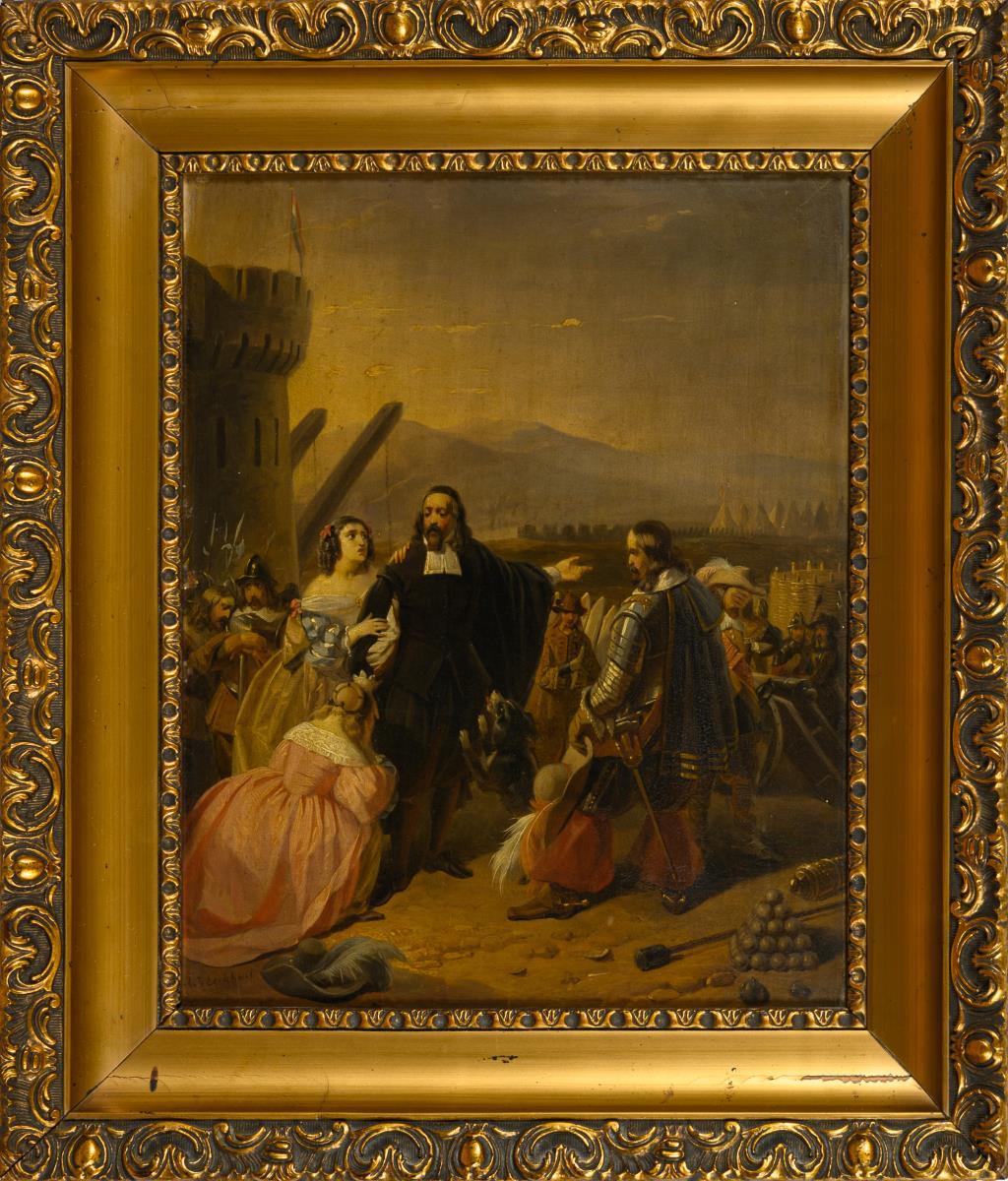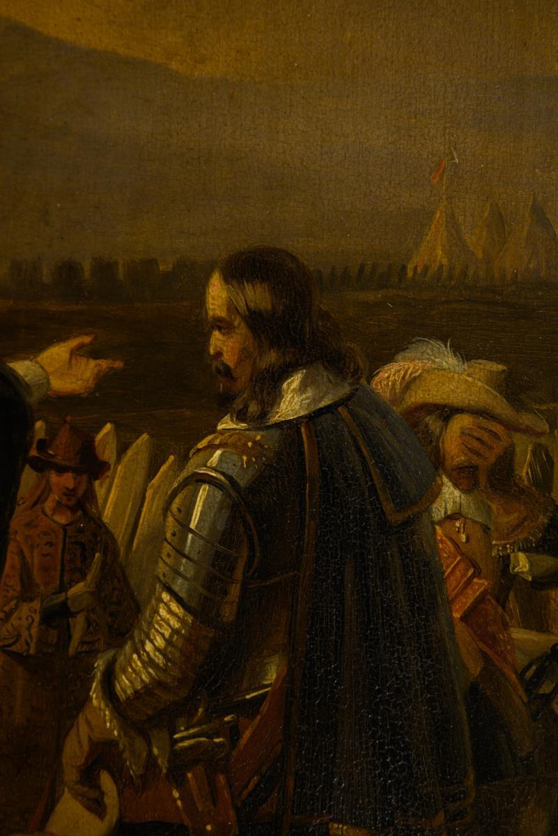 Clergyman with soldiers and women in a fortress with a view of the enemy camp in front of the mountains. Yellowed varnish.