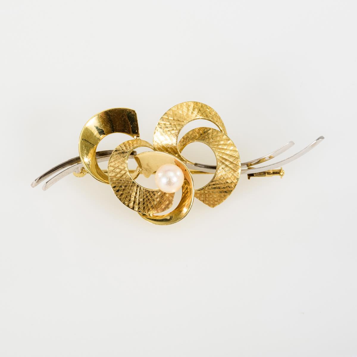 Partiell netzgravierte Bogenstegbrosche mit hellroséfarbener Zuchtperle