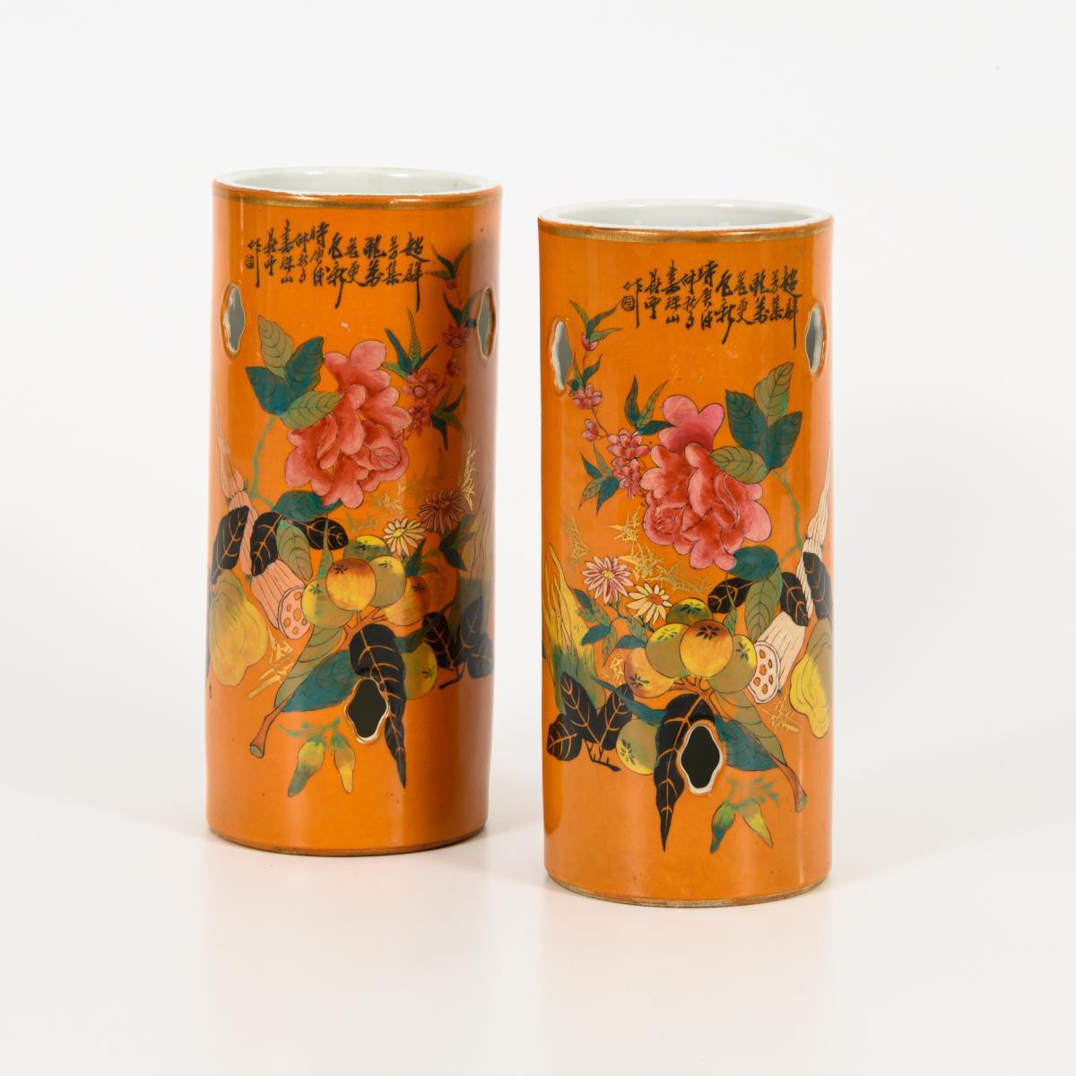 Pair of porcelain cylinder vessels with orange walls.