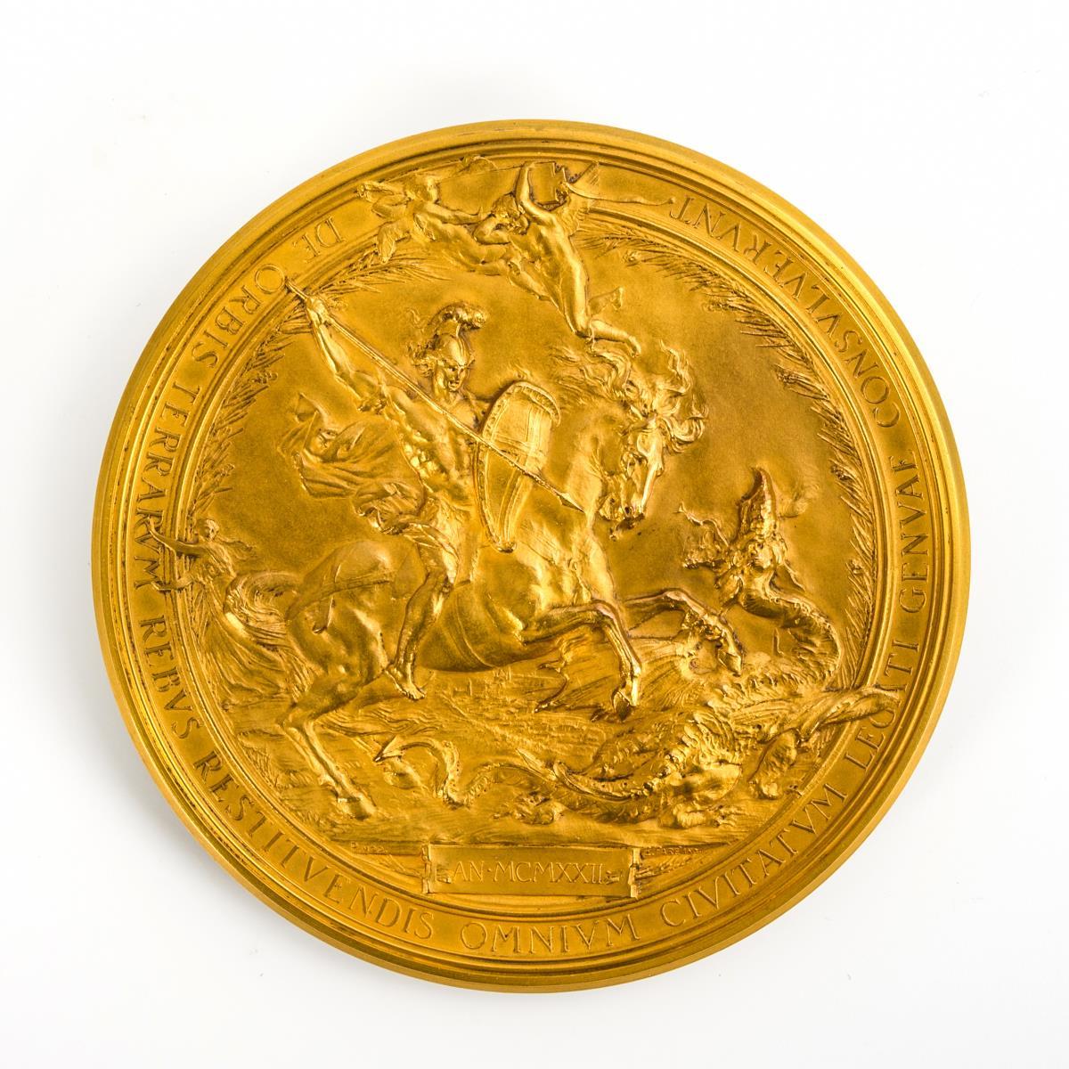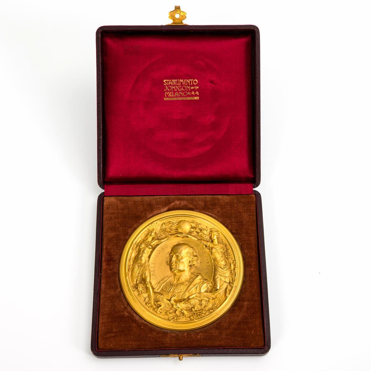 Medal in rich relief on both sides. Obverse bust portrait of Christopher Columbus with legend "Cristoforo Colombo", flanked by the allegories for America and Europe. Reverse George the Dragon Slayer with Roman date 1492 and legend to the Genoa Conference; above empty cartouche carried by genii. Minor signs of age/use to the casket.