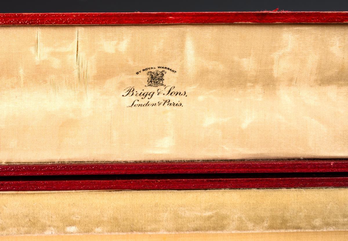 Silver knob 950/Vienna 1872-1922 hallmarked, cuff hallmarked 2x A with master's mark. / Red case "Brigg & Sons, London & Paris", threaded cuff marked "Brigg". Circa 1900