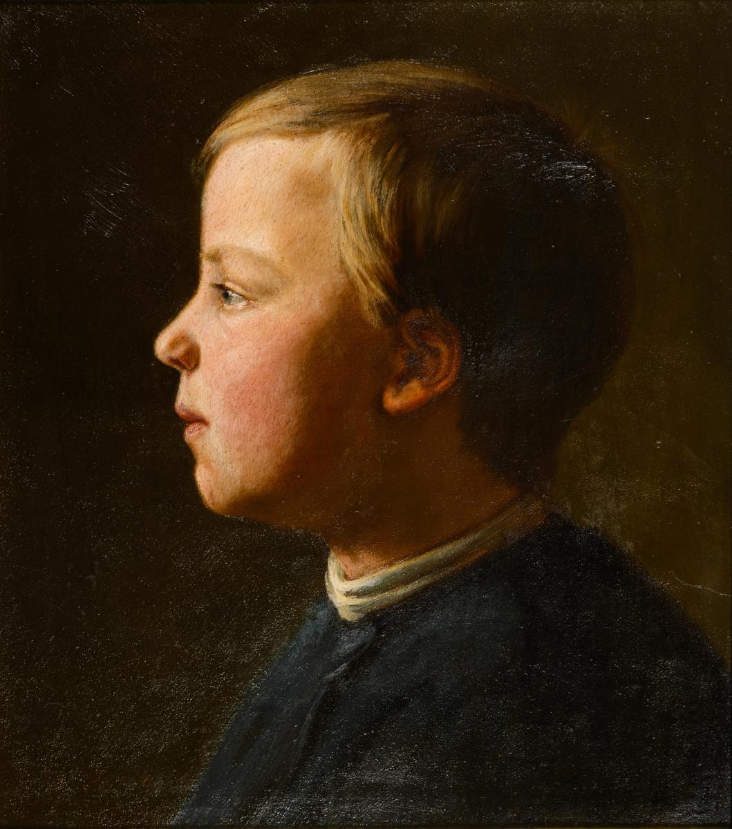 Portrait of a boy with blond hair against a neutral background. One tear in the margin.
