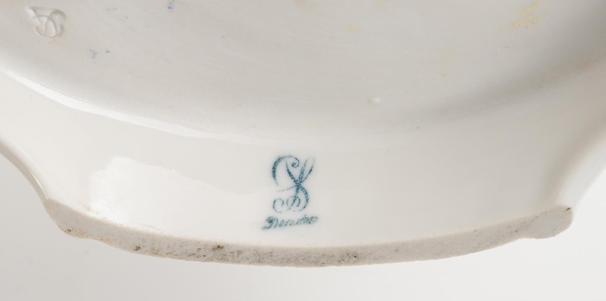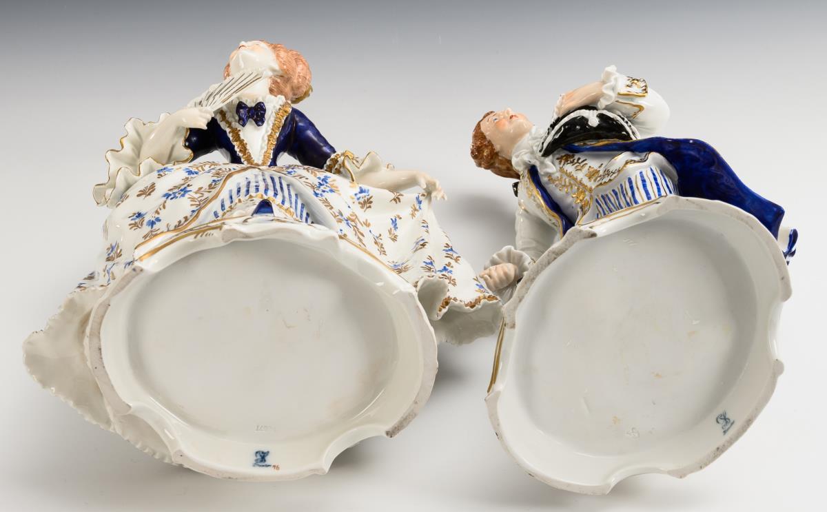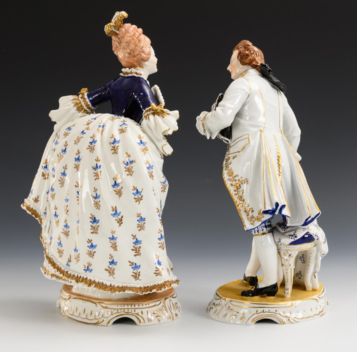 Bowing rococo lady with fan and bowing rococo gentleman. Small bump to the hem of the lady's skirt.