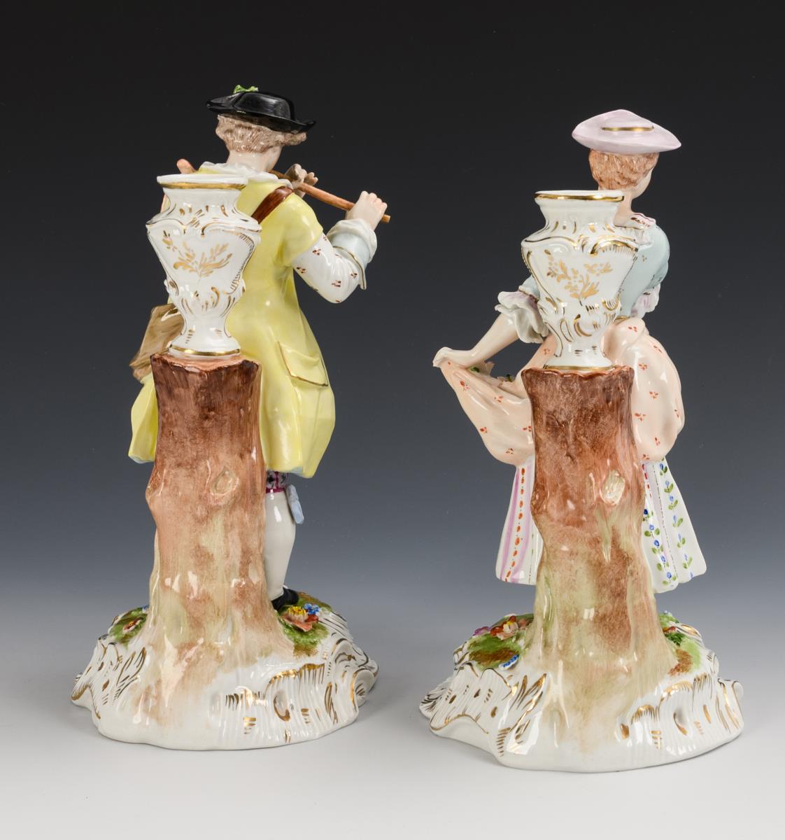 Gardener with flute and gardener with bouquet of flowers, each standing by a tree trunk with vase. Flute restored, bouquet of flowers chipped.
