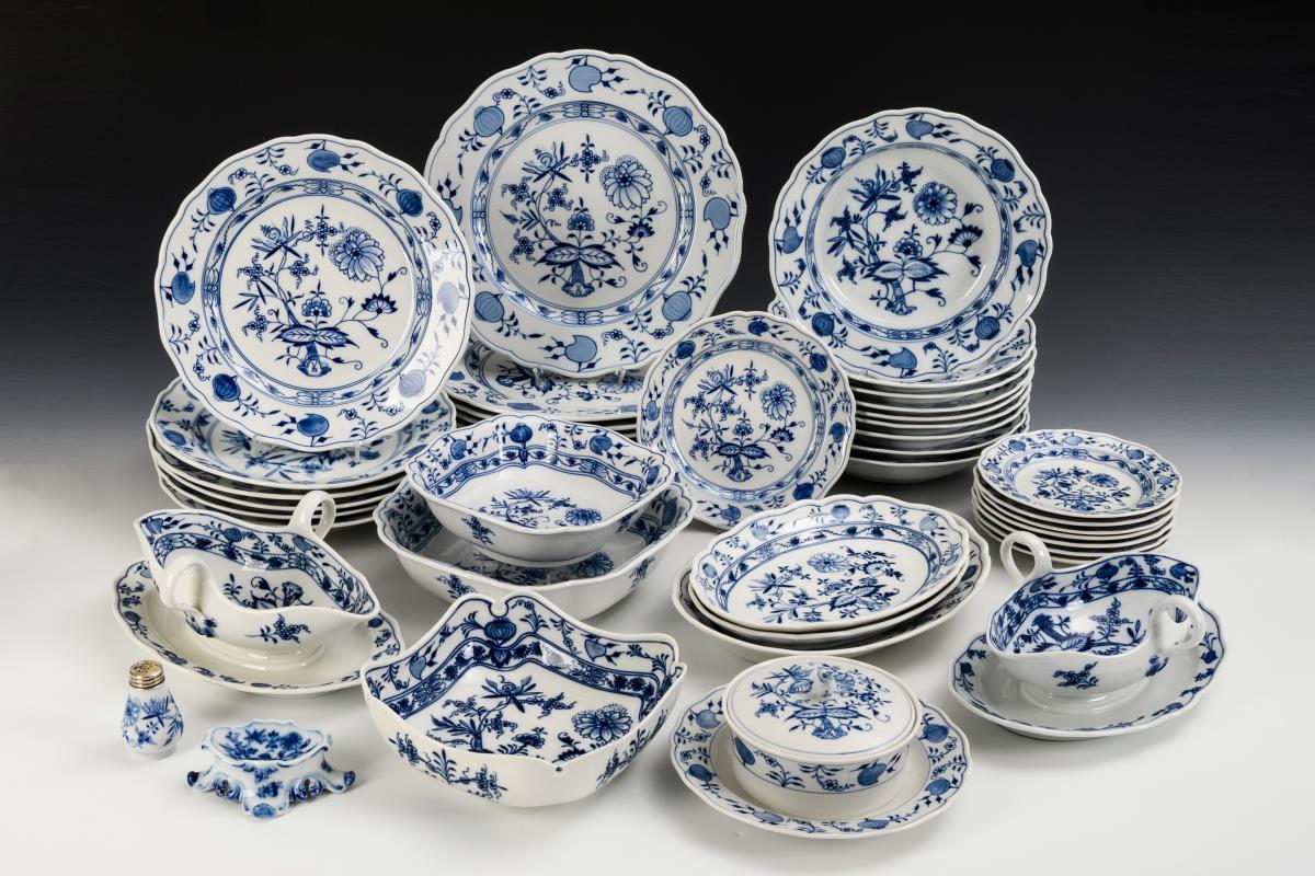 41 pieces. "New cut-out" shape. 7 place plates, 6 dinner plates, 9 soup plates, 7 + 1 side plate, 3 oval plates (L 2x 25 cm and 1x 28.5 cm), 2 sauce boats, 3 square bowls (18 x 18.5 cm, 18.5 x 18.5 cm and 22.5 x 23.5 cm), 1 butter dish (Ø 20 cm), 1 condiment shaker and 1 saliere. Hairline crack in 1 sauce boat handle and 1 soup plate.