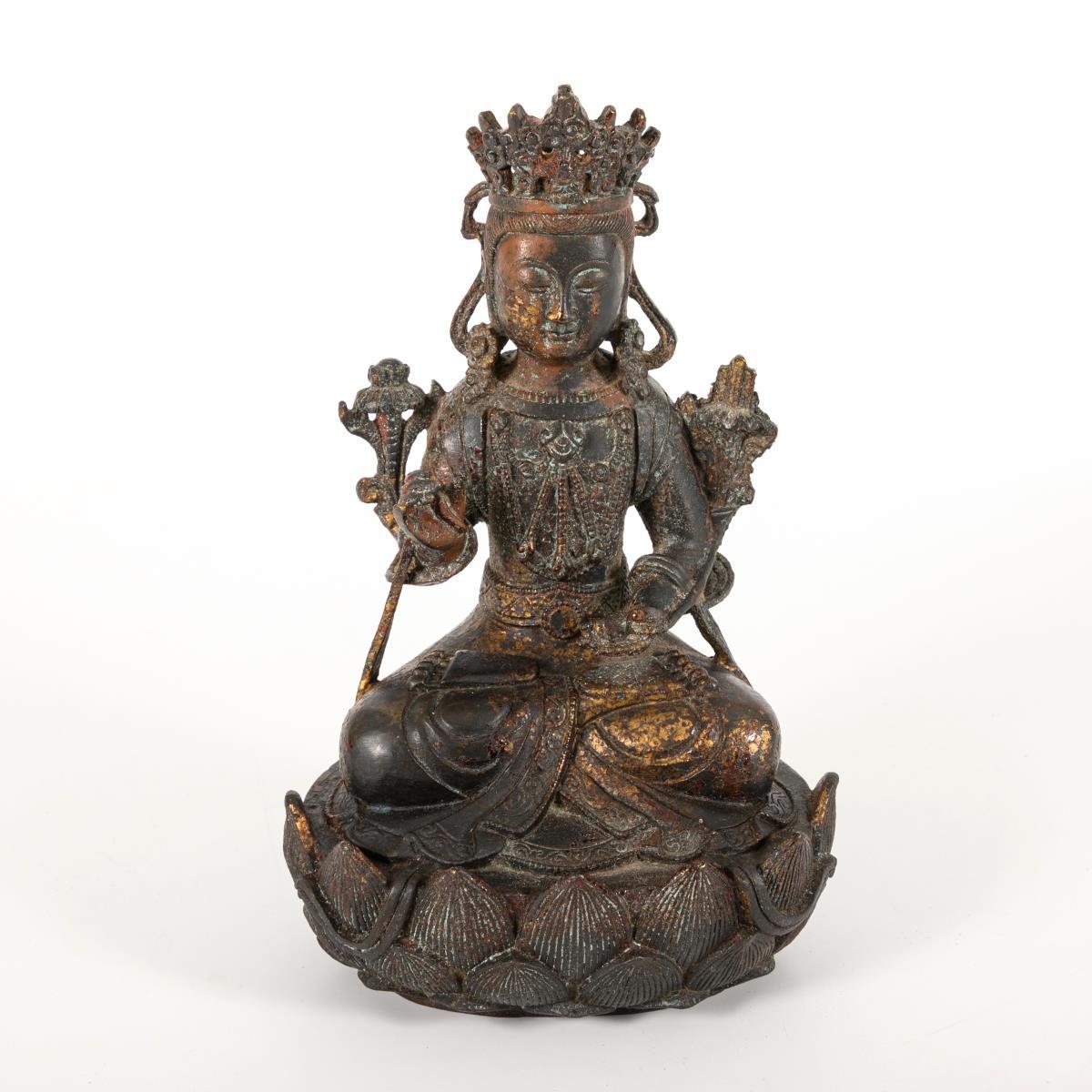 Figure seated on a three-row lotus base. Carefully executed cast with detailed surface. Remains of black-brown patination and lacquer gilding. Base open, red paint stains inside.
