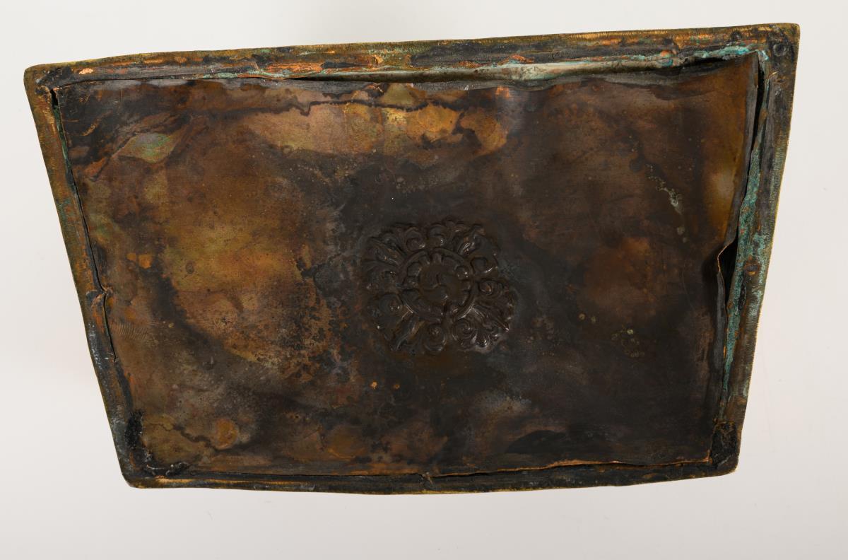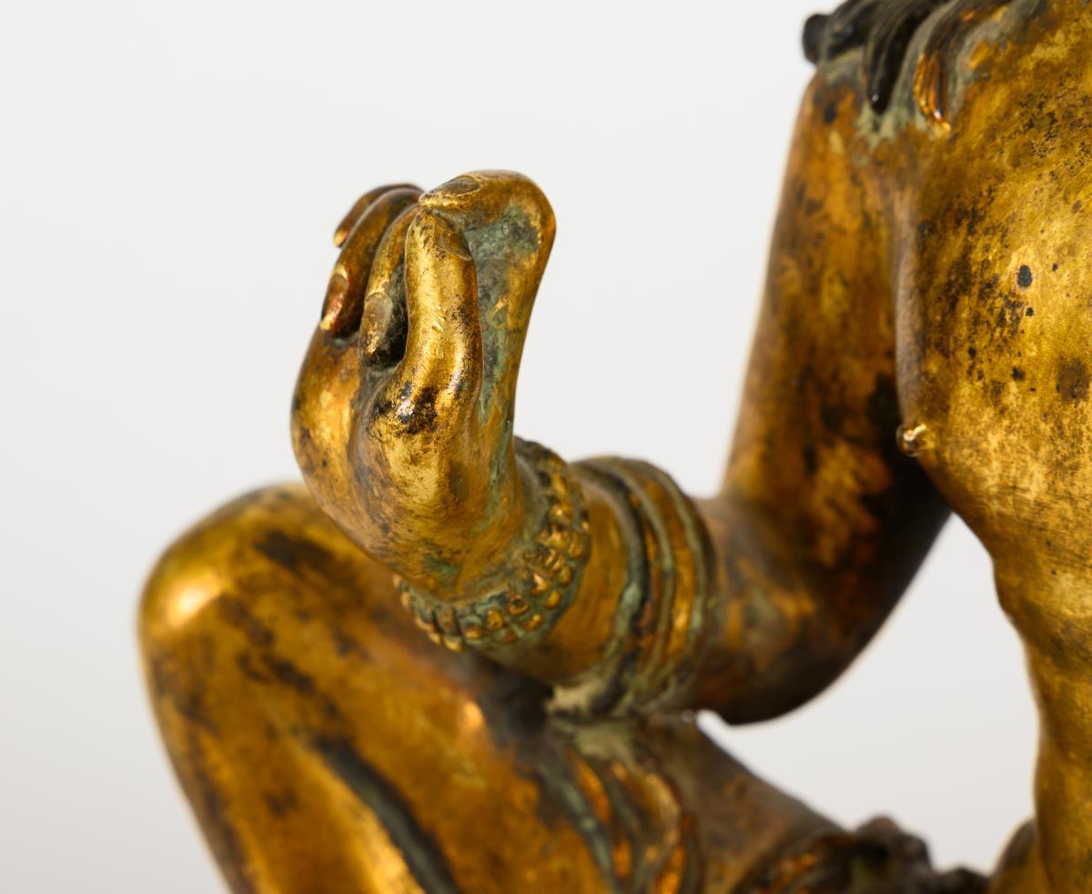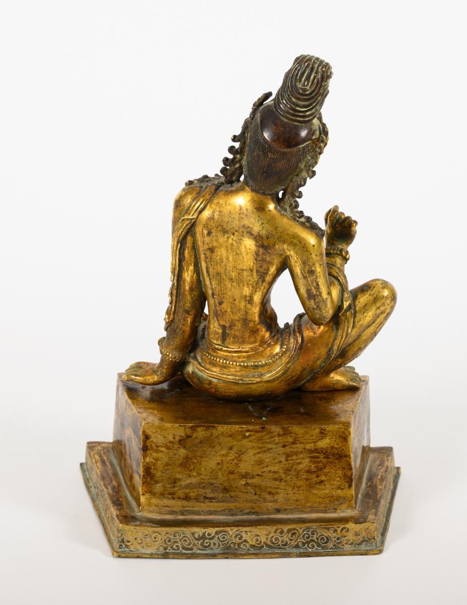 Two-part. Figure resting in a loose seat, the loincloth 'flowing' over the base. One hand with the mudra of exposition or explanation. Trapezoidal base tapering upwards with fine ornamental engraving on the lower edge. Closed base with relief pattern, somewhat dented.