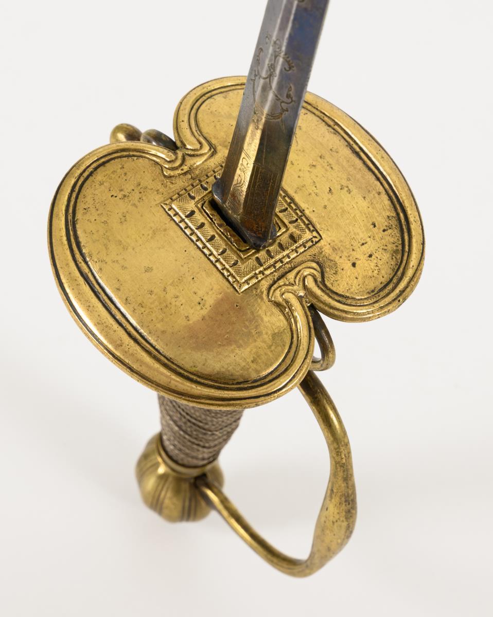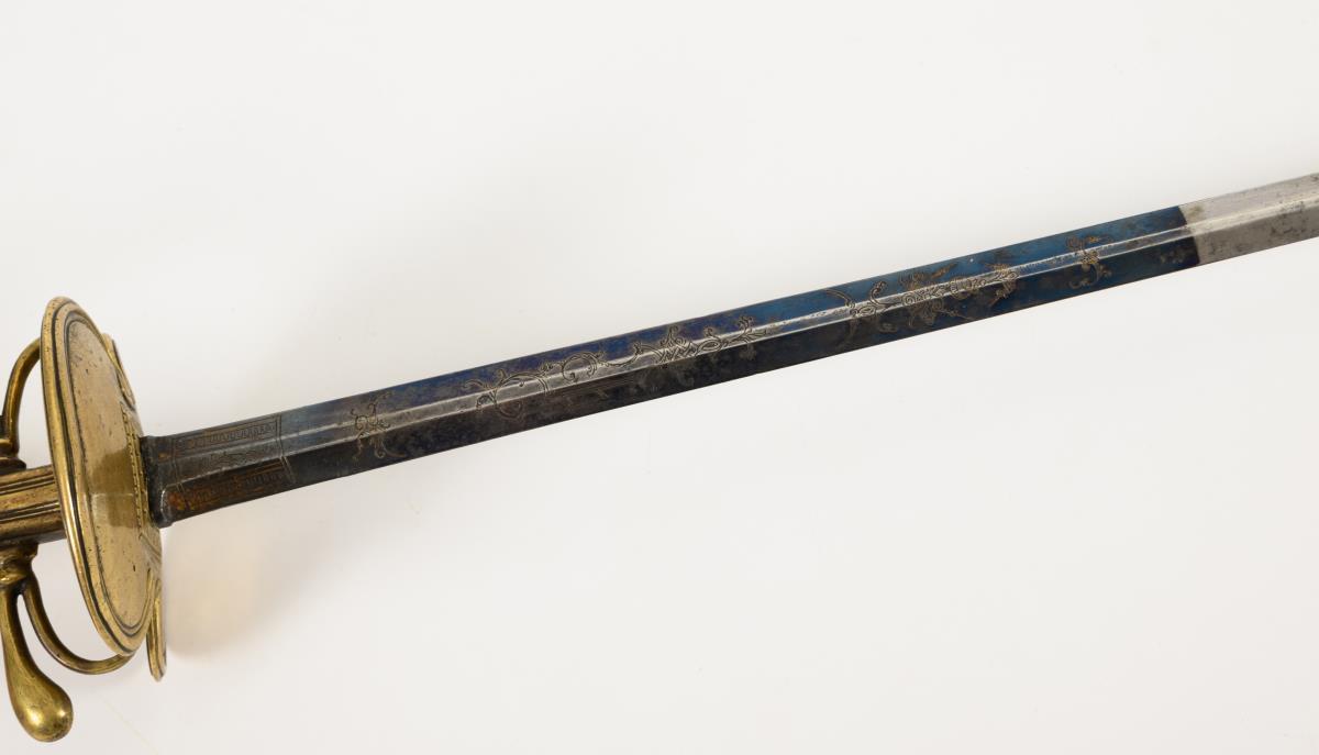 Six-edged, narrow, double-edged blade in the lower part. The lower third blued and decorated with gilt engravings, including a bird. Brass hilt with kidney-shaped guard plate, two finger rings and a straight guard. Ribbed ball pommel. Grip with multiple, dense wire winding, somewhat loose. Black leather scabbard with brass ferrules and hooks.