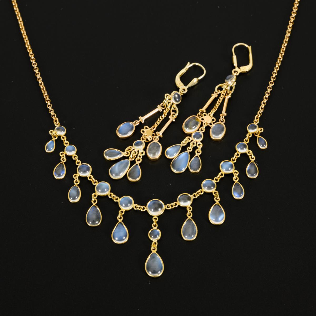 Anchor chain and pair of girandoles with set moonstone cabochons. Lobster clasp, spring bar.