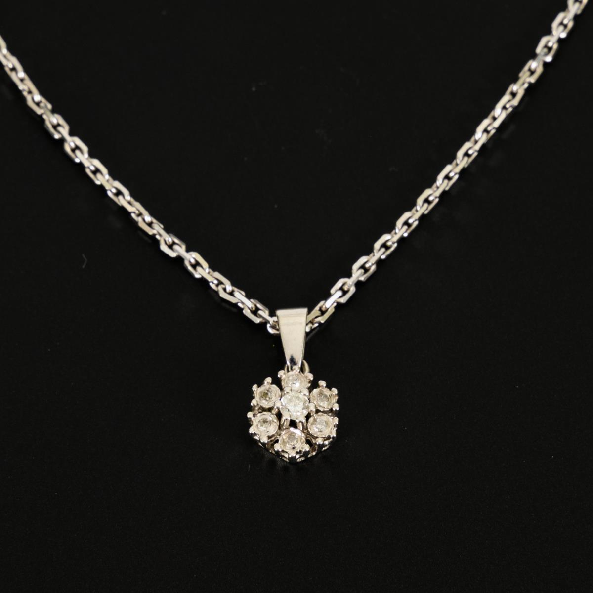 Chaton-set brilliant-cut diamond, surrounded by 6 small, embedded diamonds. Anchor chain with ring spring clasp.