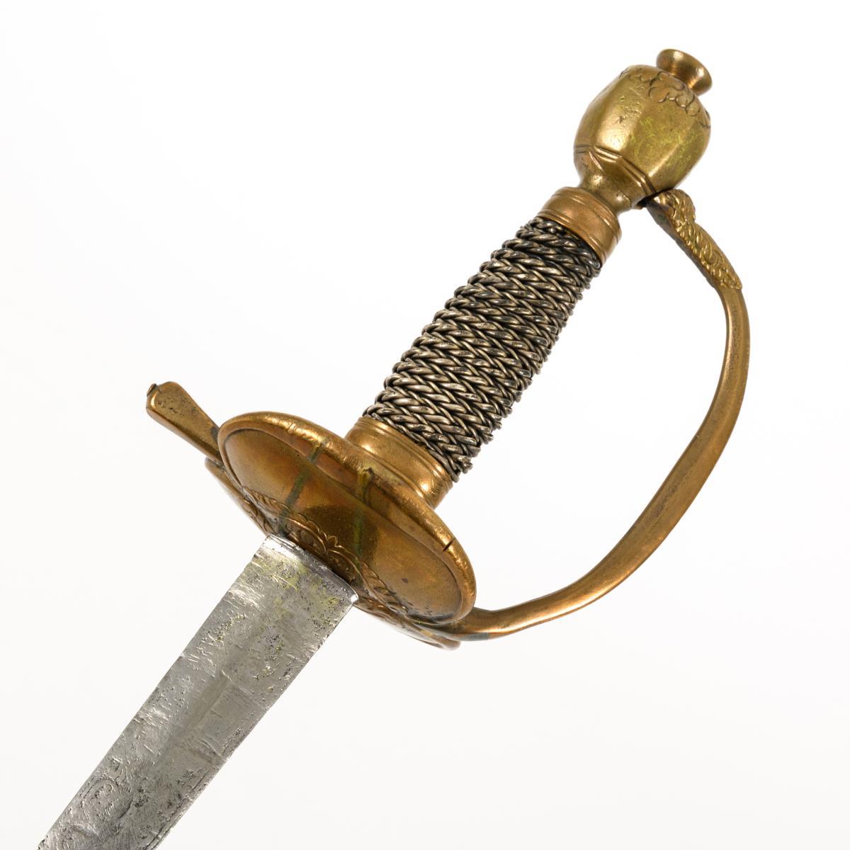 Straight, conical, double-edged blade with a point in the midline, lenticular cross-section. Pattern engraving heavily plastered in the lower quarter. Bronze-colored hilt with relatively small, kidney-shaped guard plates, patterned from below. Multi-fitting pommel with a high rivet. Strong wire winding on the grip. Comes with a black leather scabbard with decorated brass ferrules and two suspension rings. Signs of age and wear. Crossguard soldered on.