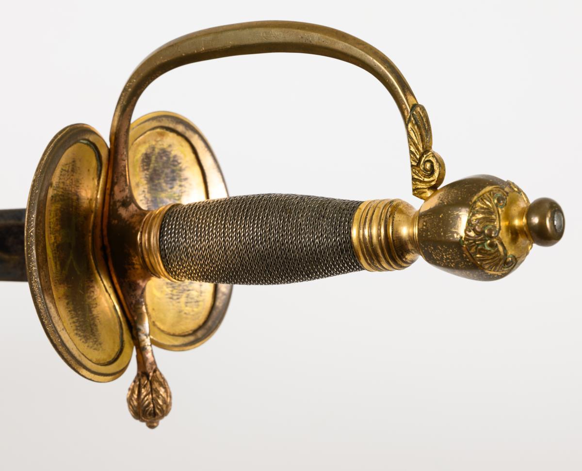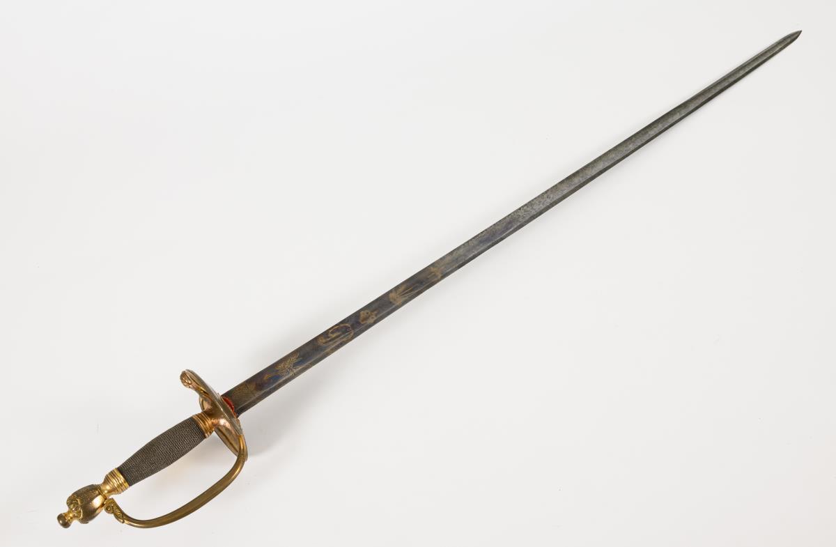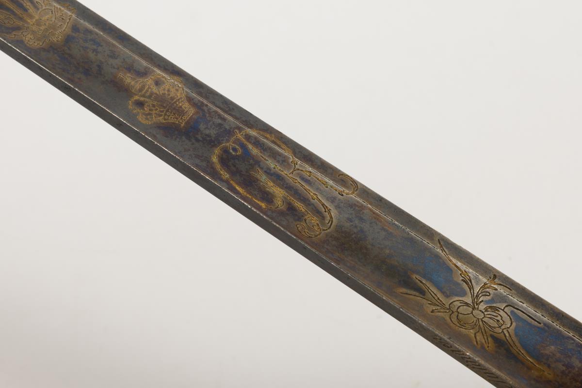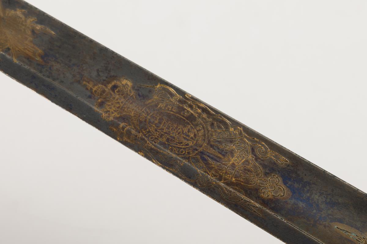 Model 1796. Straight, single-edged blade with wide fuller, double-edged at the point. Half of the blade blued, with gilt engravings, including the British-Hanoverian coat of arms with the motto of the Order of the Garter. Other side crowned monogram "GR" for George I. Brass grip in the style of an IOD.