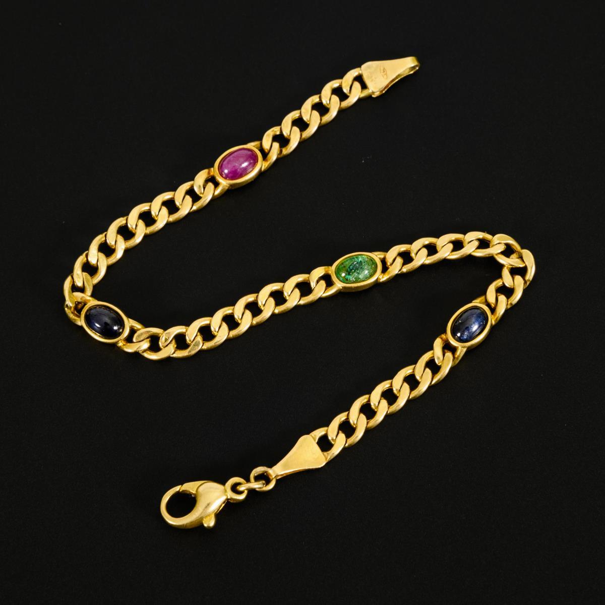 2 bezel-set sapphires, 1 emerald and 1 ruby, between curb chain with lobster clasp.