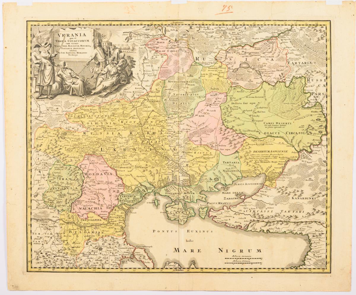 Detailed historical map of Ukraine and the Cossack territories in Wallachia, Moldavia, Asia Minor and the Tartar provinces, with figurative title cartouche "Ukrania quae et Terra Cosaccorum cum vicinis Walachiae, Moldaviae, Minorisq..., Tartariae provinciis [...]" and mileage indicator. Bow crease, some foxing, handling and crease marks, backglued areas on verso, small notes "70" and "75" in pencil and red chalk in upper margin.