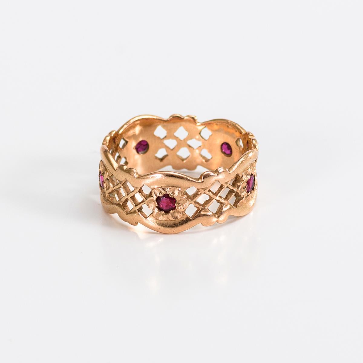 Reif mit 5 kleinen, in reliefierten Blüten eingelassenen Rubinen.