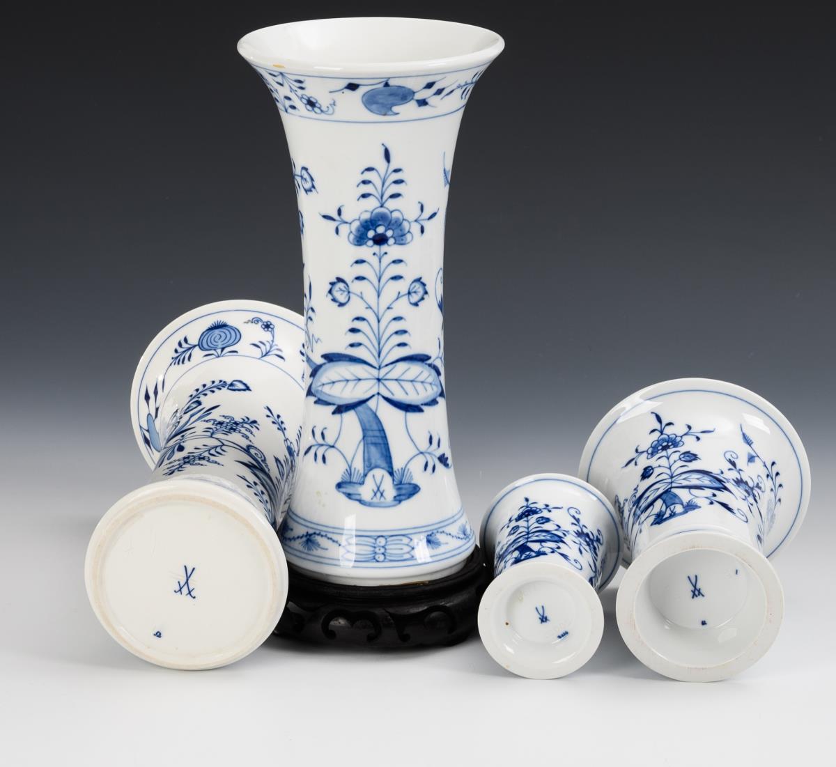 2 flute vases (1x with wooden base; h 23.5 and 29 cm). / 1 krater vase (H 14 cm). / 1 conical vase (H 10.5 cm). 1x with rim trim and rim chip.