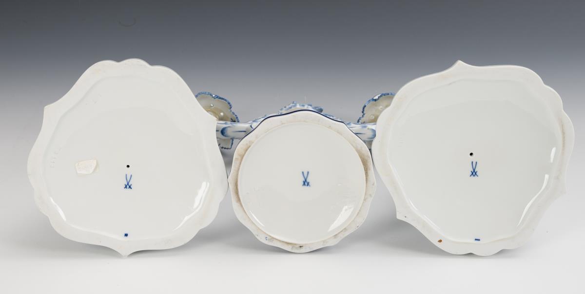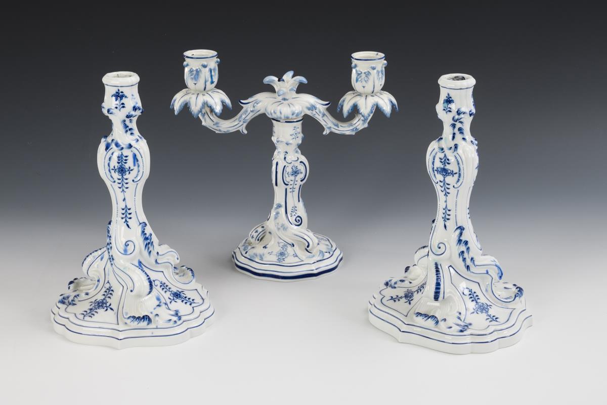 2 1-light rocaille candlesticks (H 25.5 cm) and 1 2-light rocaille candlestick (H 23 cm).
