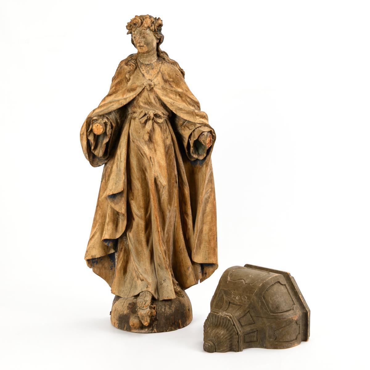 Lime wood hollowed out on the back, remains of a frame. 17th century. 96 x 44 x 19 cm, H console 30 cm. 9.6 + 4.2 kg.