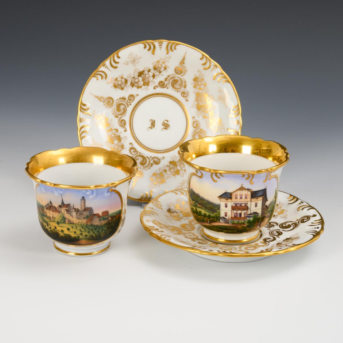 Footed bell-shaped cups with rocaille handles, relief and matching rim. On the front a gold-framed cartouche, 1x with a house view and 1x with a castle view (the latter dated "Den 8. Januar 1859" and monogrammed "J. S." in the mirror of the saucer), verso vegetal gold painting. 1x with wall hairline crack in the cup.