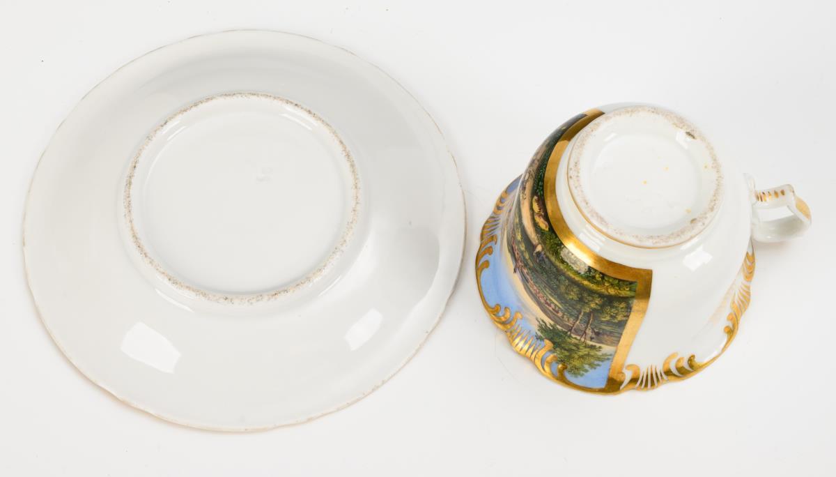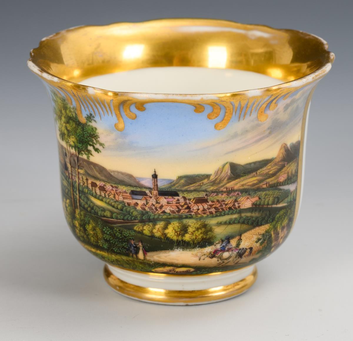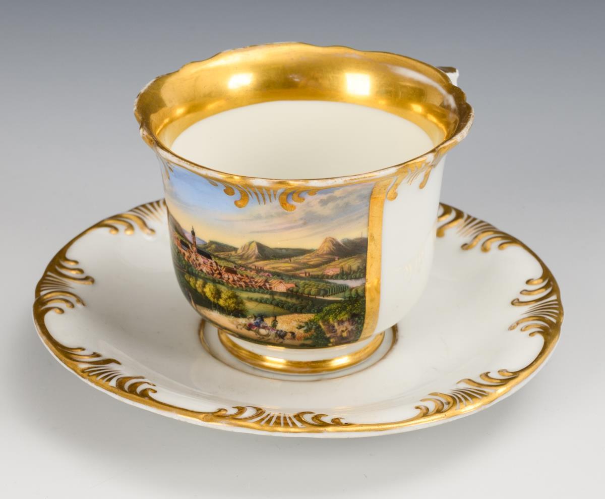 Footed bell-shaped cup with rocaille handle and rocaille rim. On the front a gold-framed rectangular cartouche with a view of the city of Jena, in the mirror of the saucer the dedication "G. Kirsten s/m l. A. Sauerteig z. fr. Er., Jena 1860". Minimal gold abrasion, hairline crack in the handle, view in the foreground somewhat rubbed.