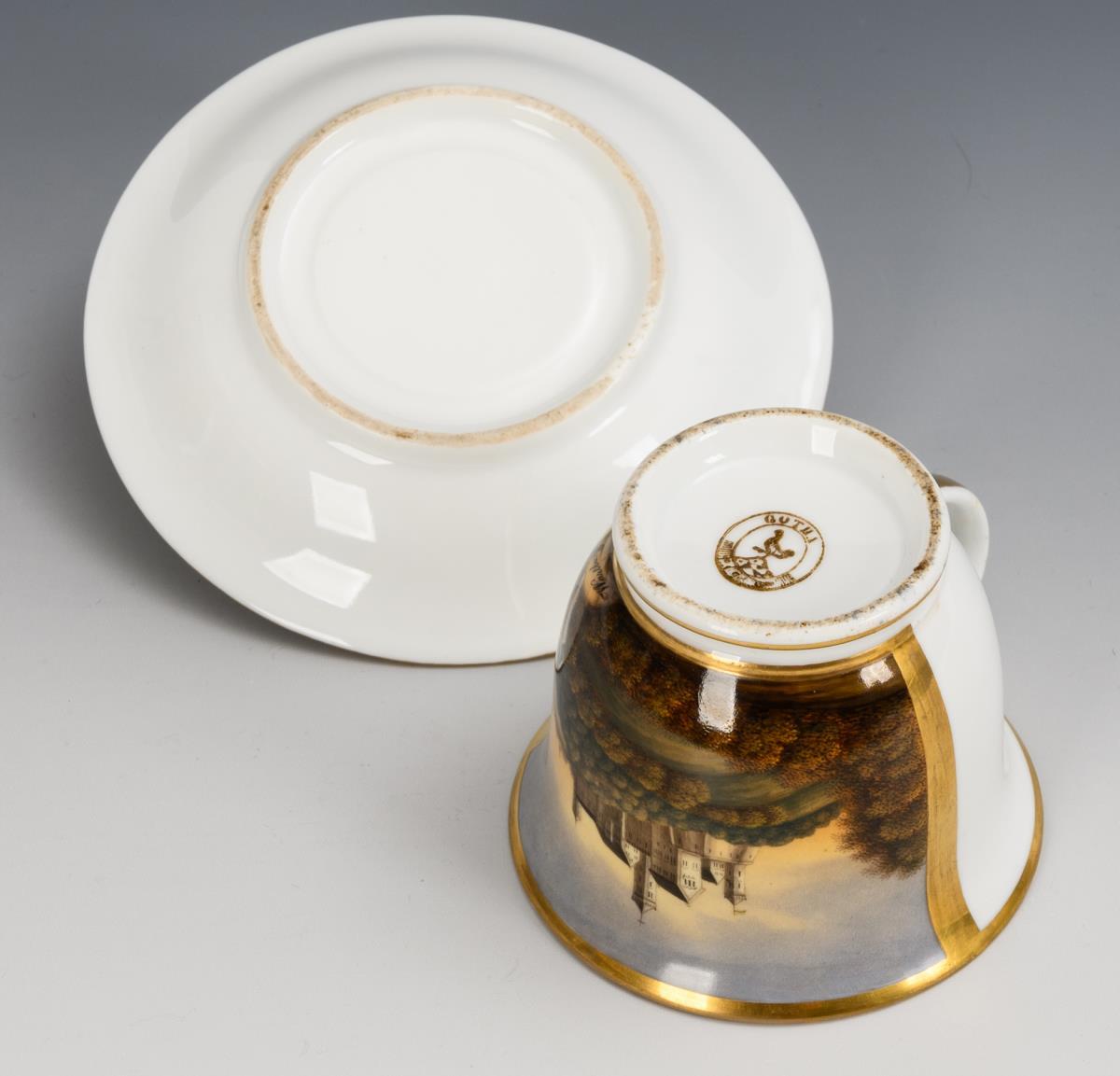 Polychrome painted, decorated in gold. Cup (h 7 cm), completed saucer (Ø 14 cm).