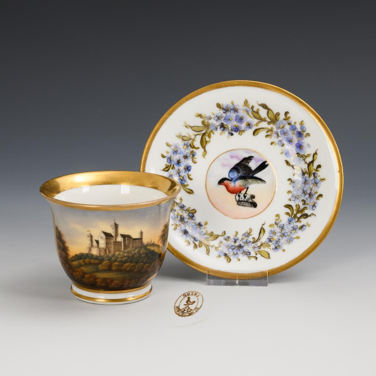 Footed bell-shaped cup with ear-shaped handle. On the front a gold-framed rectangular cartouche with the view of Wartburg Castle near Eisenach.
