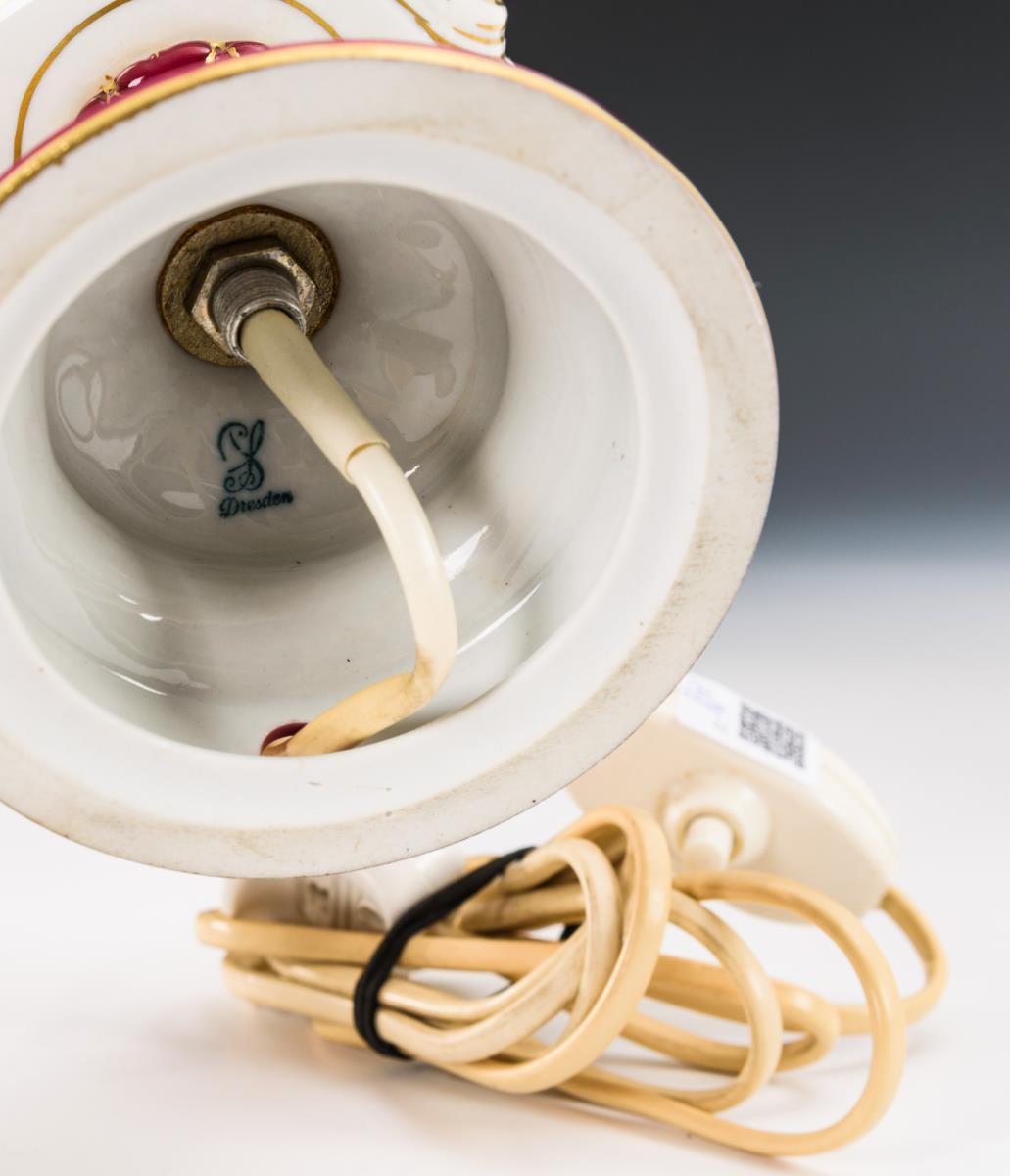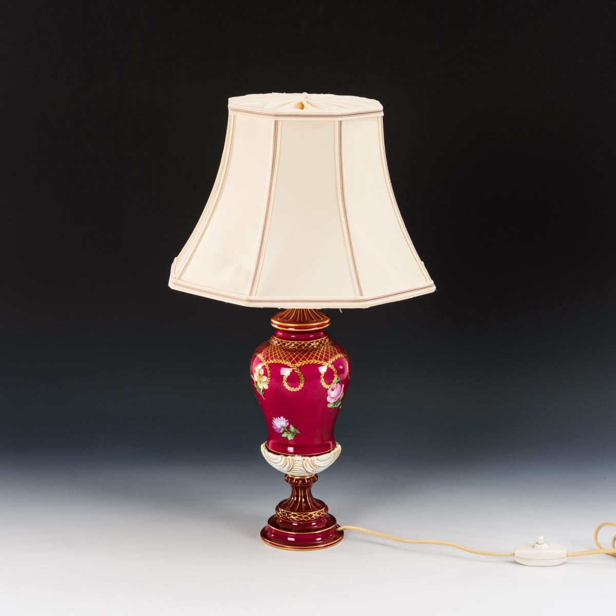 Balusterkorpus, Rundfuß, mit Stoffschirm. Elektrifiziert (Funktion nicht geprüft).
