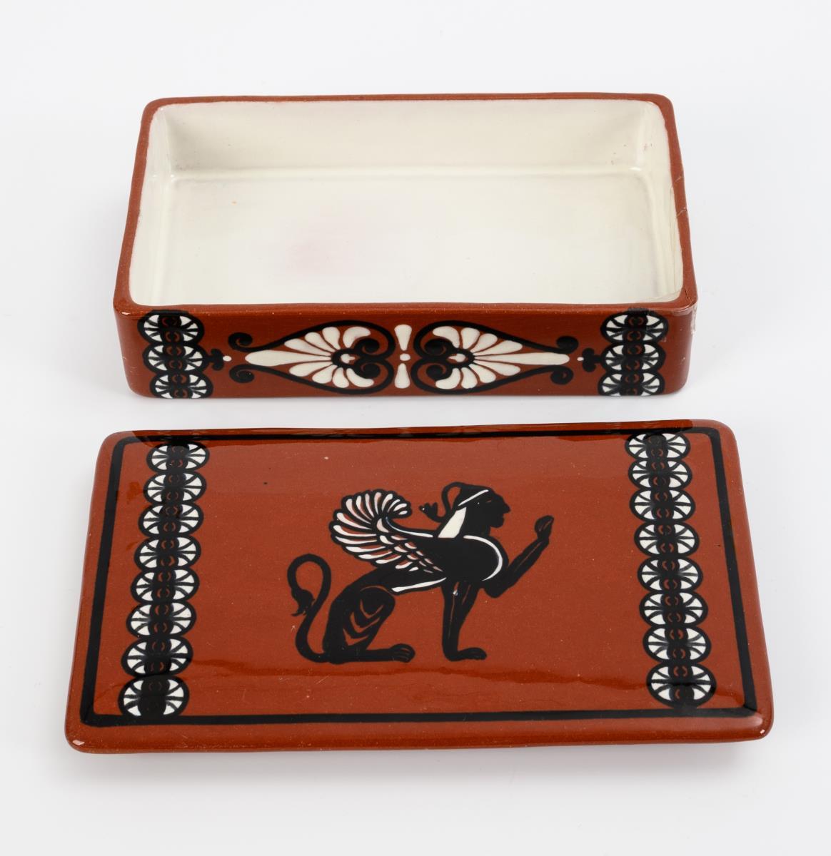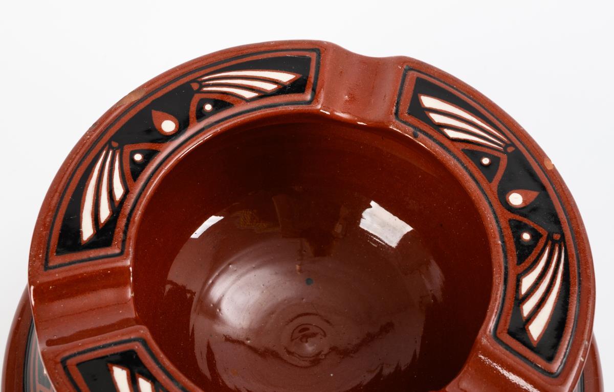 Round ashtray with high foot (model no. 221a, Ø 18.5 cm), flat rectangular bowl with sphinx (model no. 112, Ø 12.5 cm). Bowl rim with chipping, ashtray rim chipped.